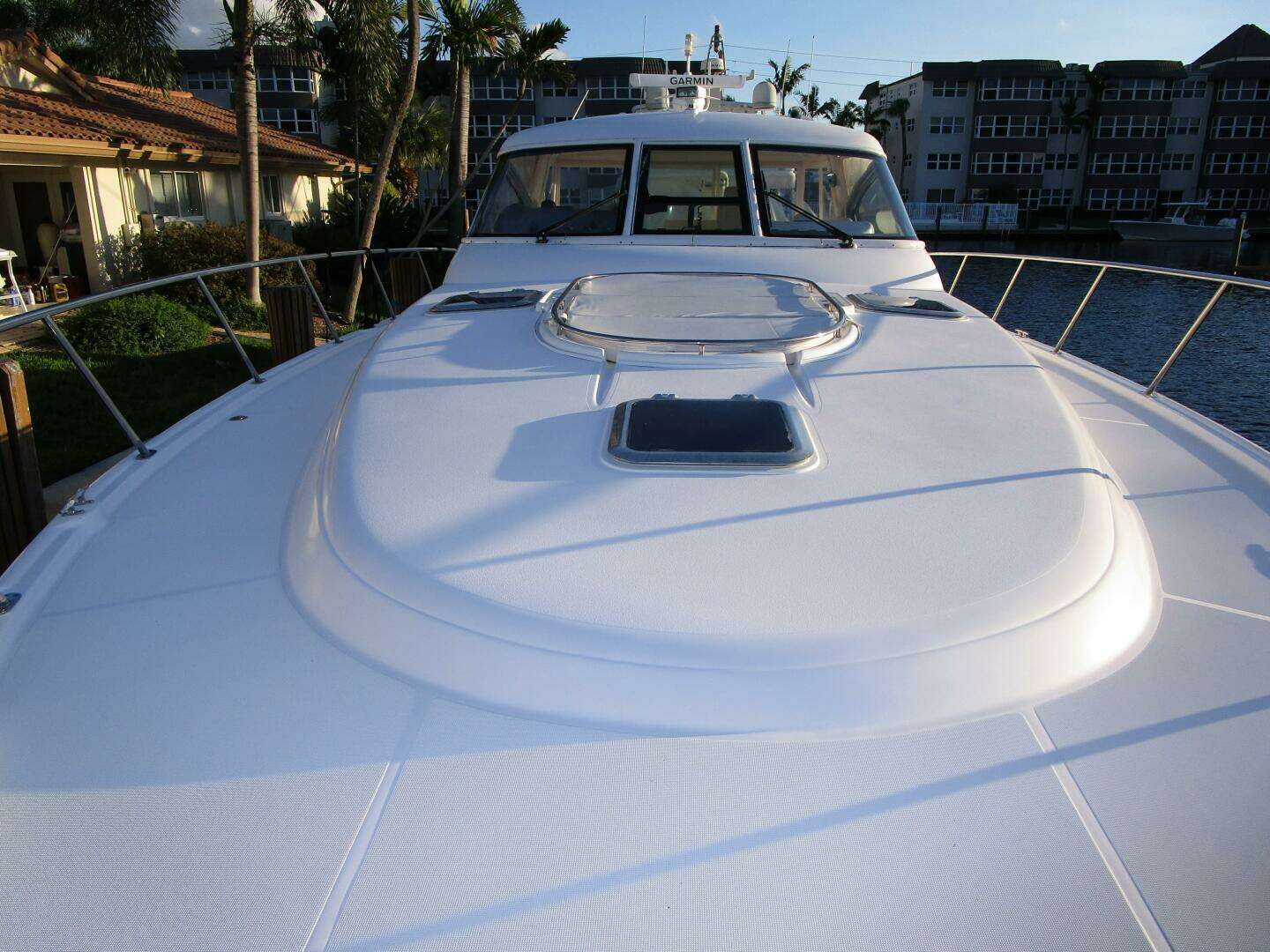 Back to the exterior aft cockpit area, easy access to the walkaround non-skid decks and the bow is thru molded steps and easy multiple grab rails each side of the cockpit area. The two oversized stainless steel bow railings ensures secure passage to the bow forward that features a centerline “Bunny Pad” for sunbathing with safety grab rails around and built-in glass holders and cover.