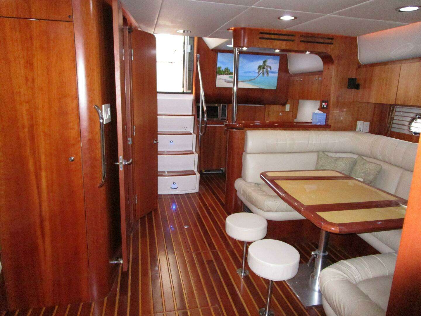 Forward to port is a C-shaped ultra-leather settee to seat five people. A hi-lo table lies in front. Two removable stools add additional seating. Outboard of the settee are four top opening cherry cabinets with two opening stainless steel portholes and wood blinds below.