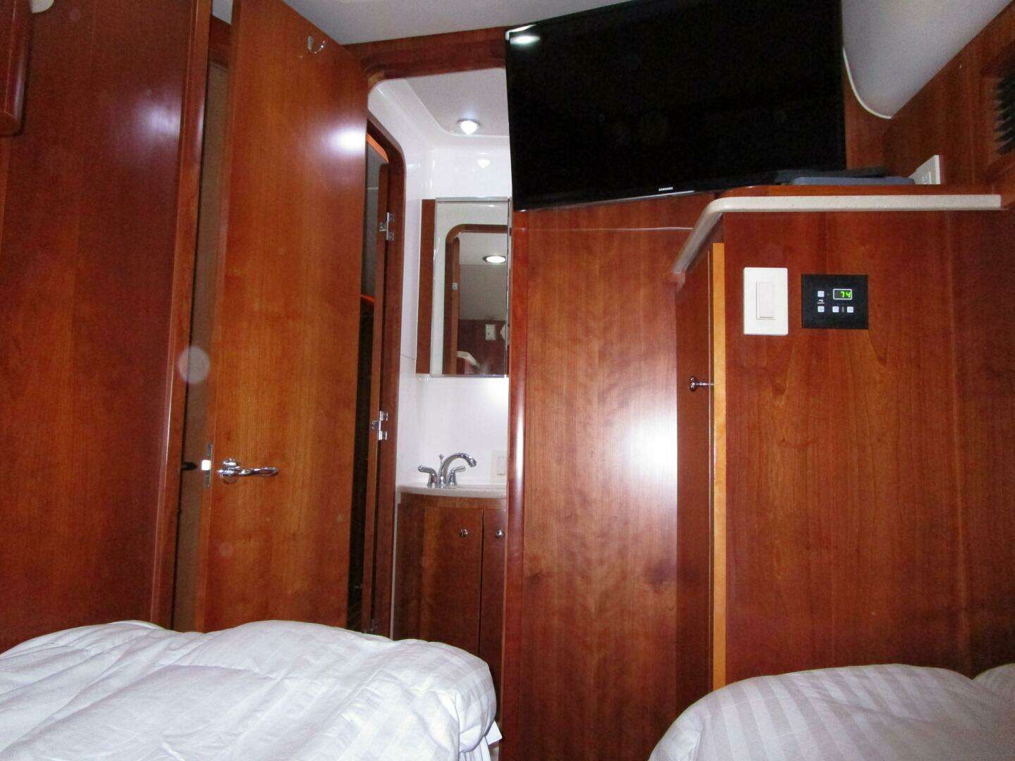 Outboard are two cherry cabinets with lights below that are above an opening stainless steel porthole. Forward of the outboard berth is a half-height, cedar lined, auto lit, hanging locker and a 30” Samsung TV. Forward is a door into the guest/day head.