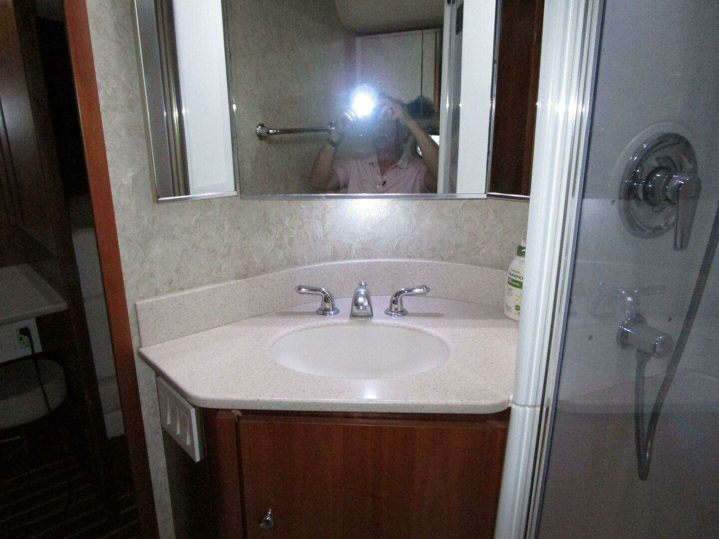 Accessed from the guest cabin or the centerline cabin area is the guest head that with its’ second door doubles as the day head. The cherry vanity has two doors below and a Corian seamless sink and countertop above. Two mirrored medicine cabinets are above.