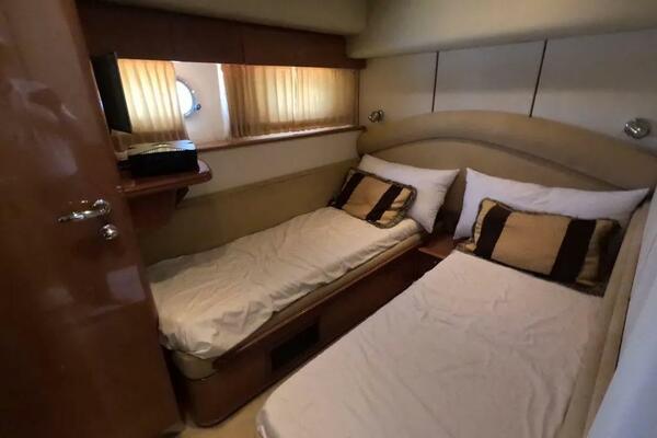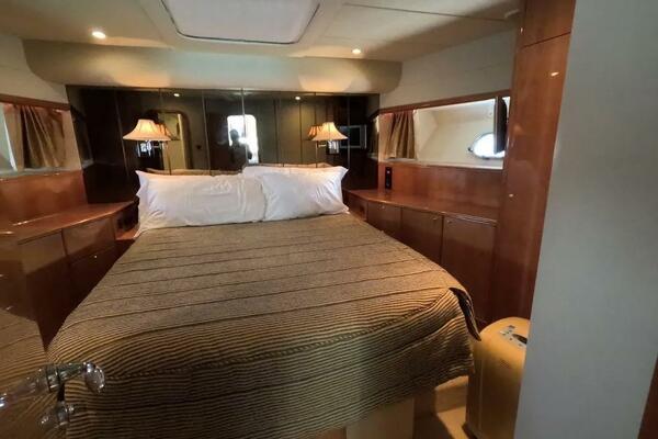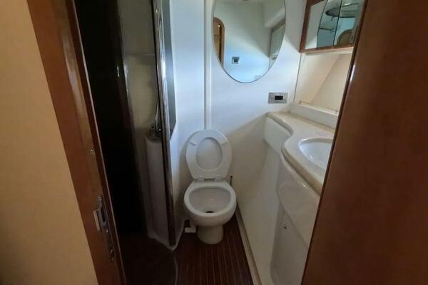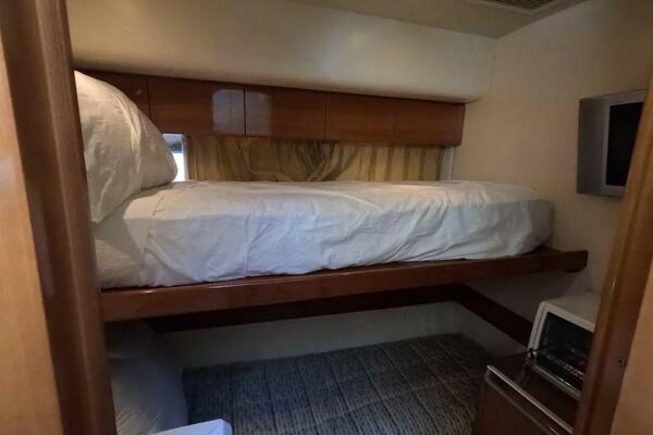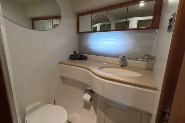 The galley is large and chef friendly with a side-by-side refrigerator/freezer and a dish washer. The 4 cabin layout gives enough room for 10 to stay comfortably. The starboard guest stateroom has 4 single berths with the private entry to the day head. A large guest cabin with private head is forward. Walking towards the stern of the boat, enter the owner’s stateroom. To port, a marine grade head with vanity and to starboard, a tub with a separate vanity.