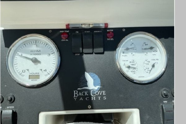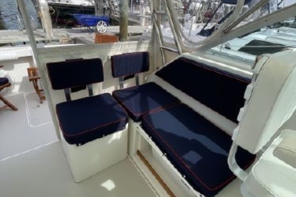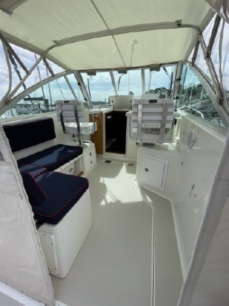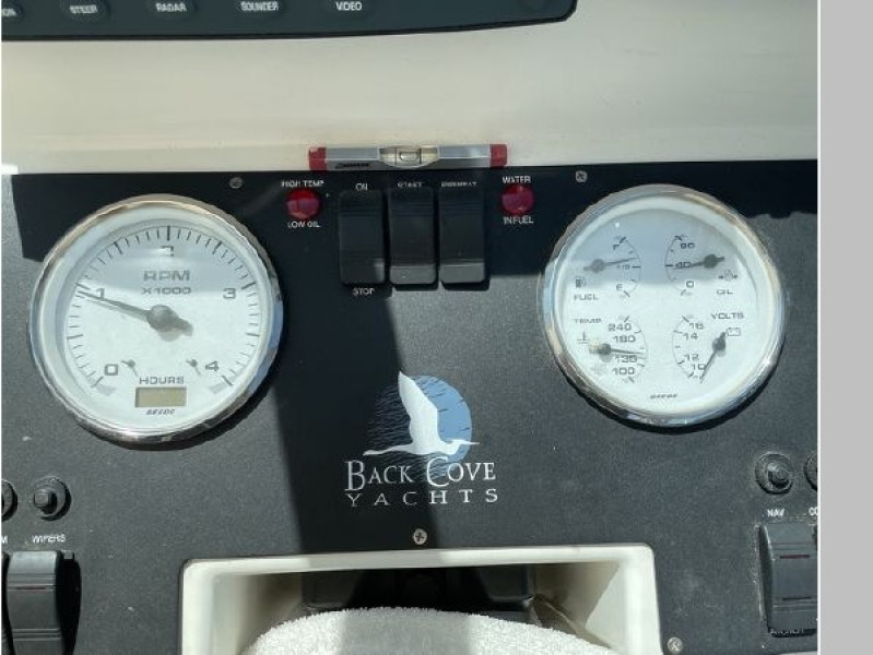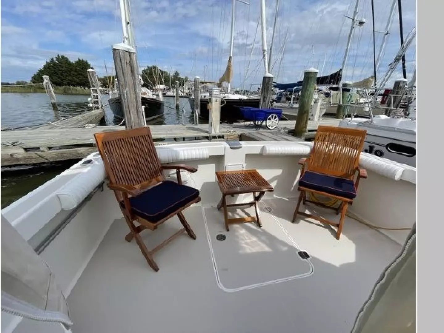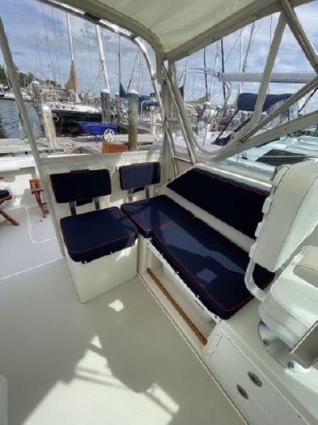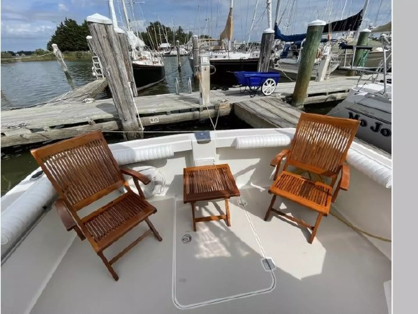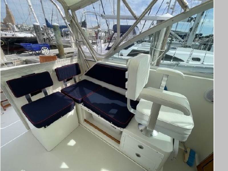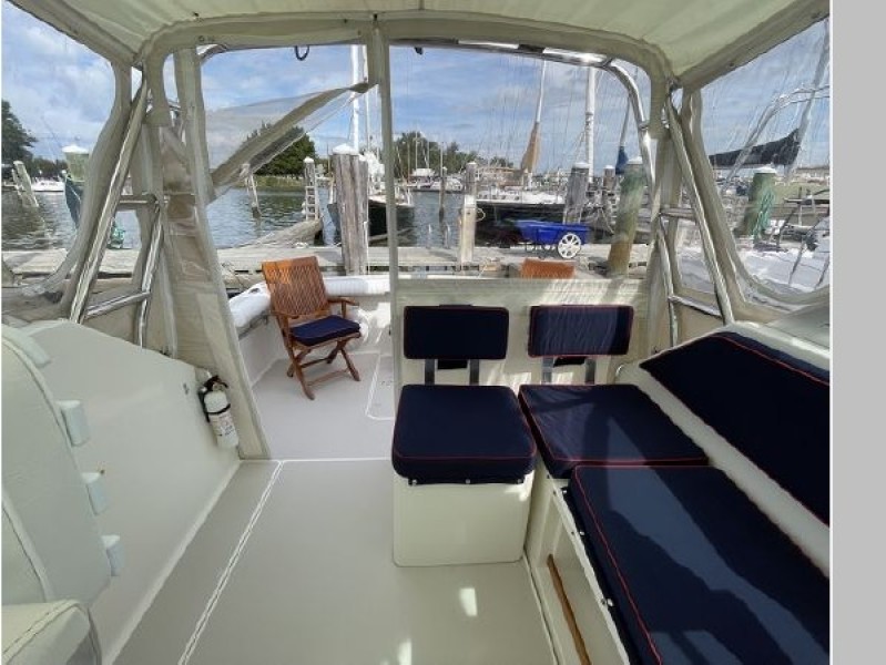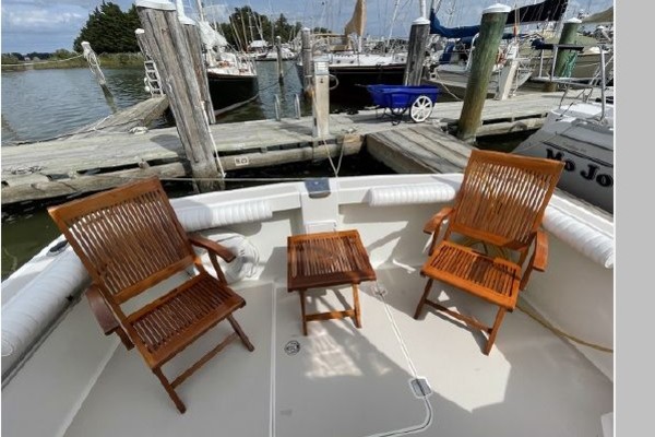 Up the companionway to the bridge deck with helm to starboard and mates seat to port followed by an L-shaped settee. Her cockpit is very open and the owners opted not to have the built in bench seat and rather chose lovely Teak folding chairs with cushions and a matching teak table. If you like to fish, she does have bolsters around the combings in the cockpit for ease in leaning into that perfect catch. As with all the Back Cove's she has built-in steps that lead to her nice wide side decks, making access forward very easy. She has an anchor locker on the foredeck with electric windlass and a nice size swim platform off the transom.