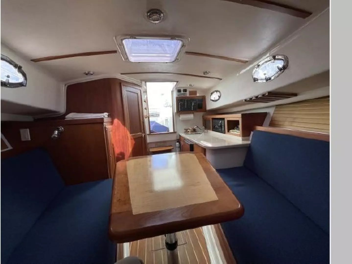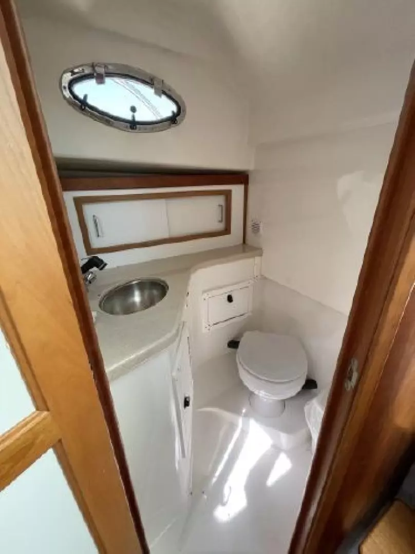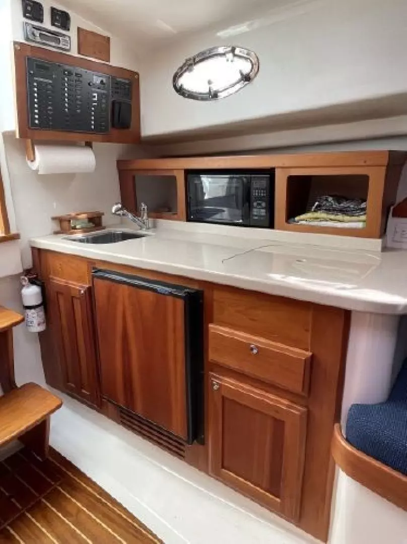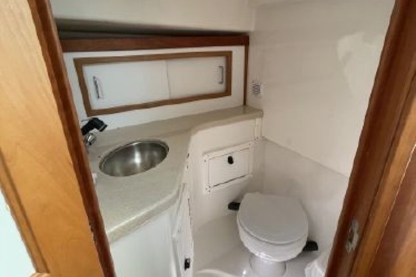 The large V-shaped dinette is forward and easily converts to the double berth with a hi/low table. Aft to port is her galley with all the essentials for fixing meals. Opposite the galley is her fully enclosed head with toilet, vanity and telephone shower.