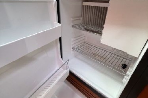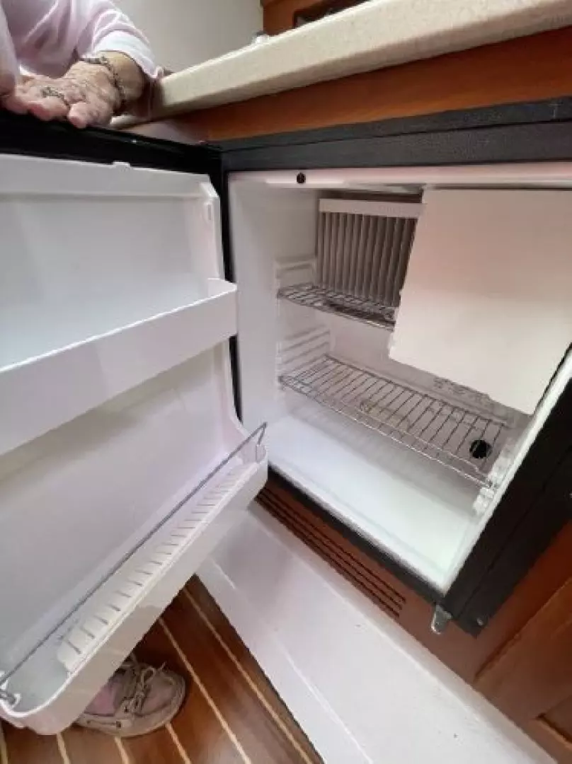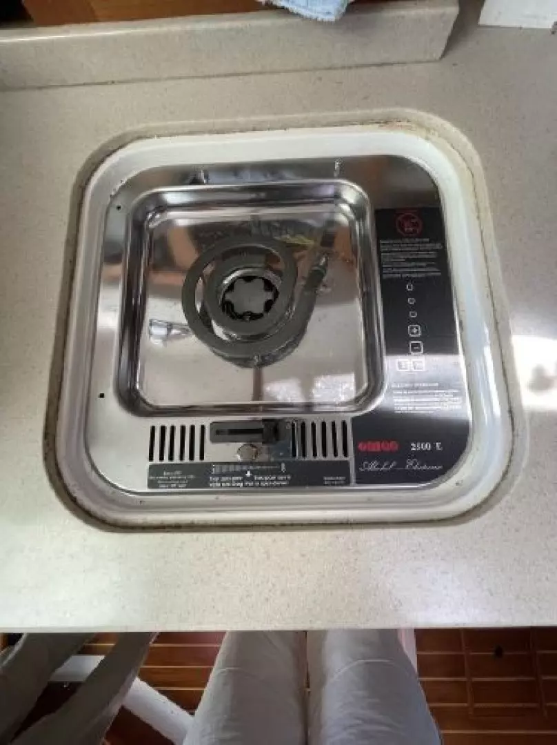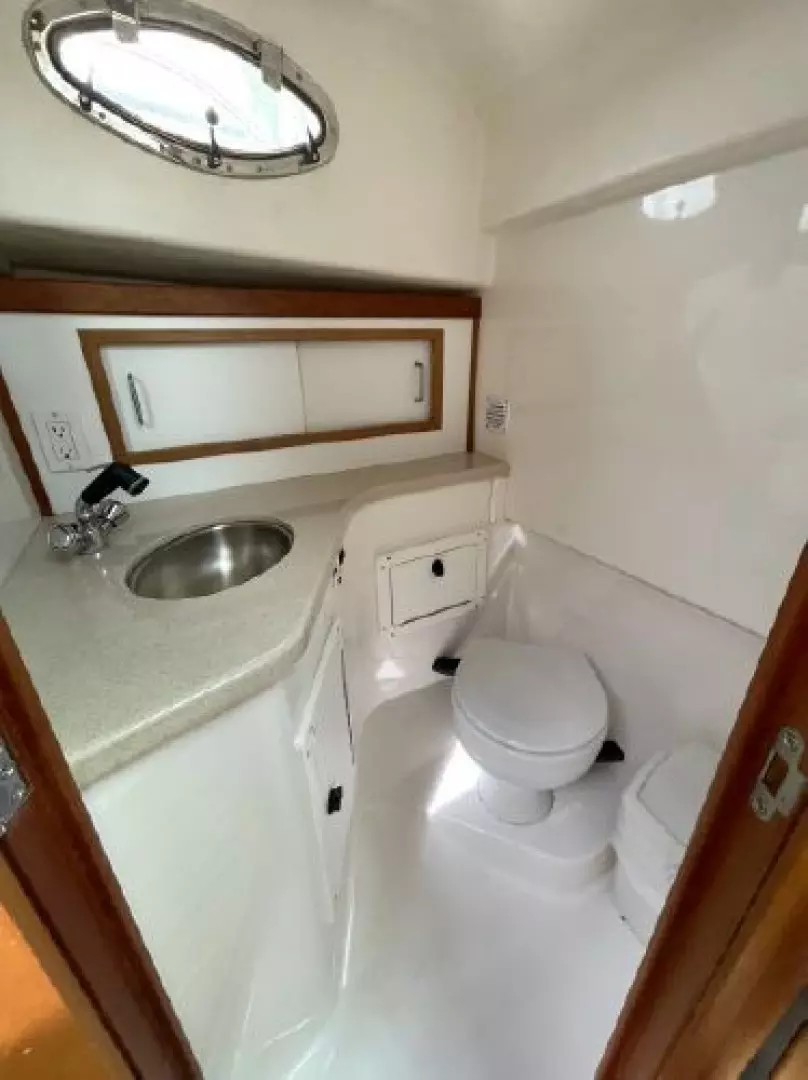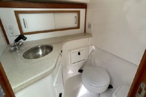 The large V-shaped dinette is forward and easily converts to the double berth with a hi/low table. Aft to port is her galley with all the essentials for fixing meals. Opposite the galley is her fully enclosed head with toilet, vanity and telephone shower.
