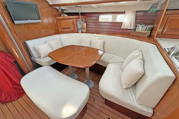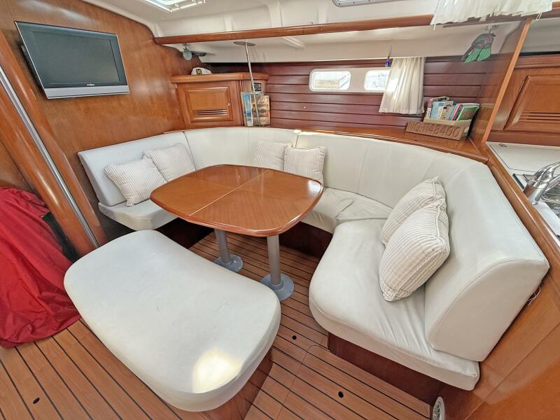 The saloon features a large settee and table to port. Seating for eight. Saloon table converts to another king-sized guest berth or an excellent place to watch the mounted television. The port settee also converts to a single berth.