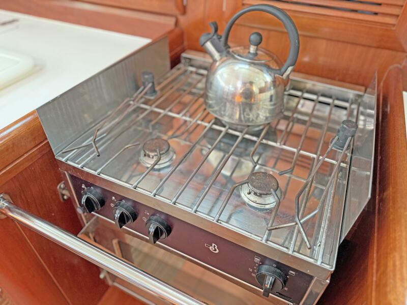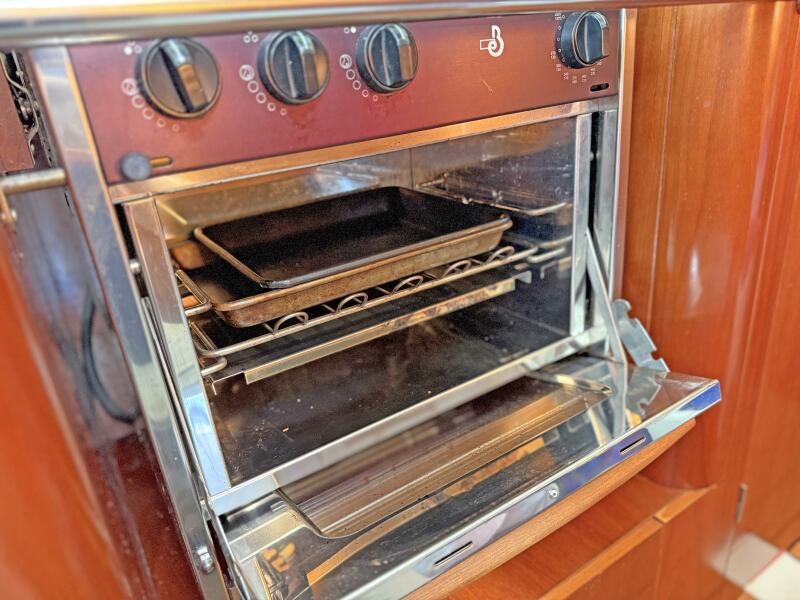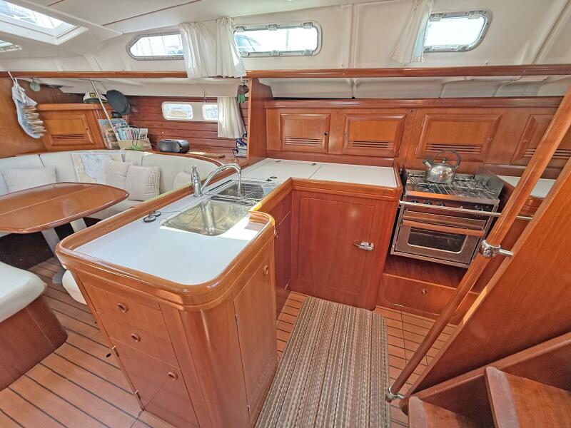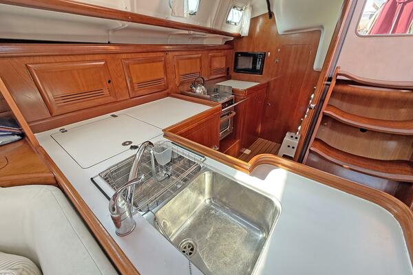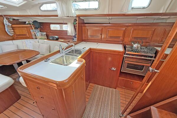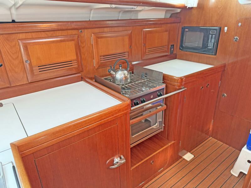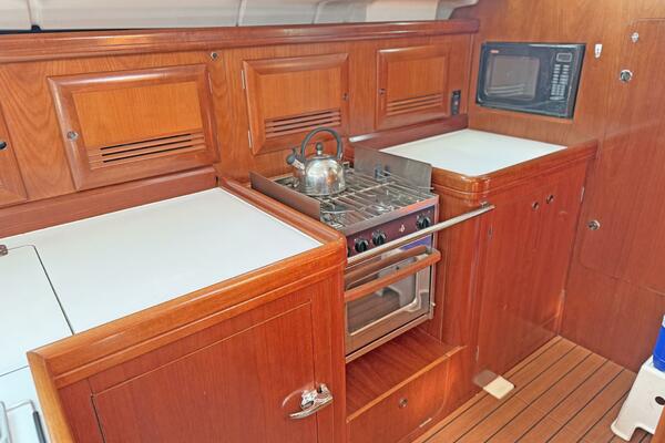 Large, seakindly galley. Another advantage of the two cabin version is the considerably larger galley with extra storage and preparation space.