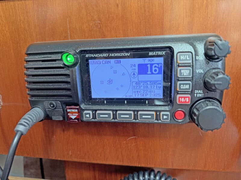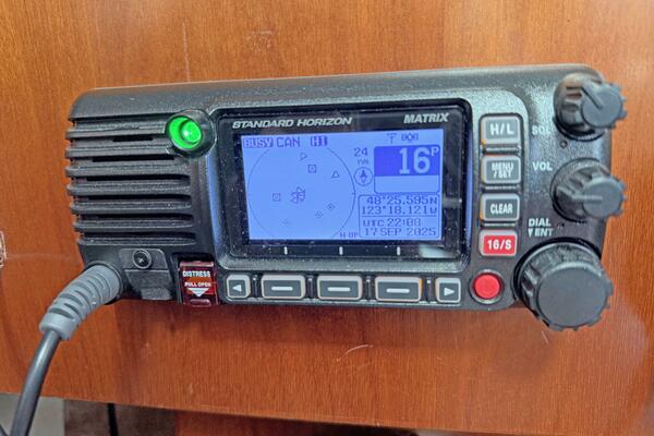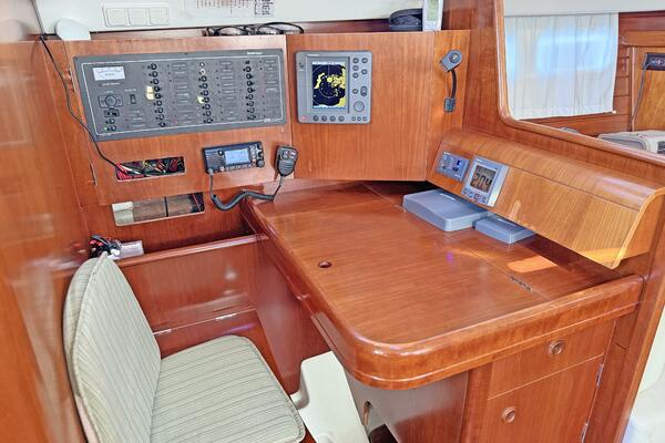 To port is the large forward facing chart table with radar, VHF and multifunction display at hand.