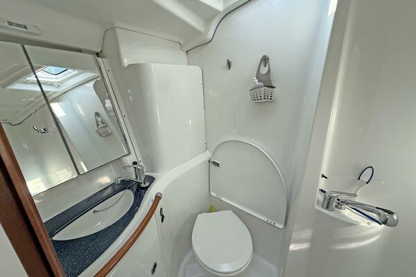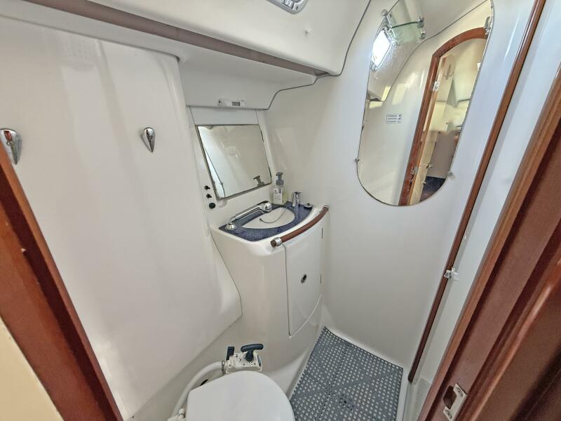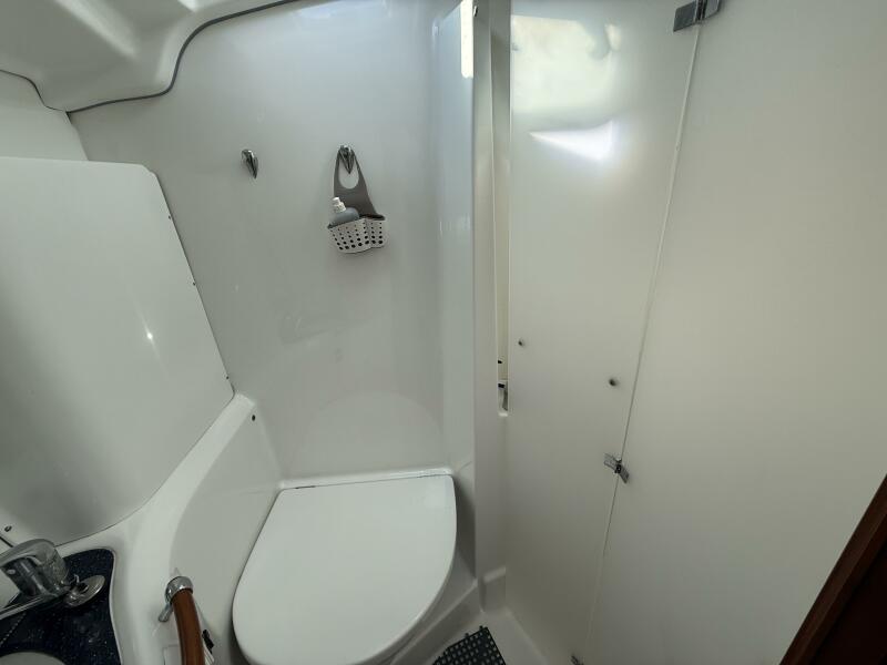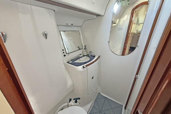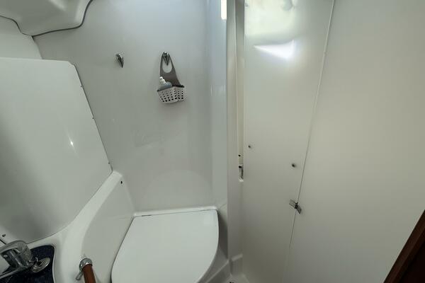 Private ensuite head with separate shower area. Electric head. Fold down seat for rough weather showering offshore.