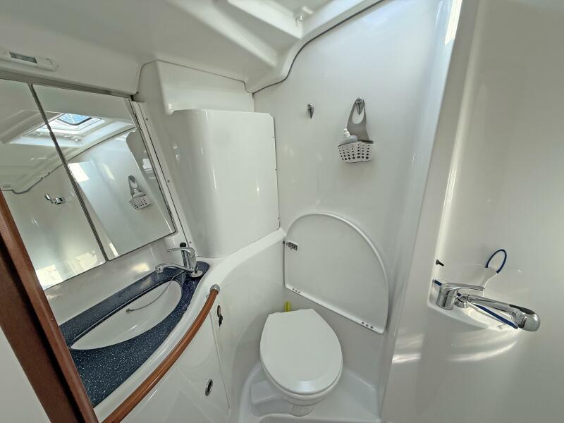 The guest head is conveniently near the companionway stairs with easy access to the saloon or the guest cabin.