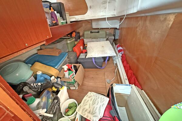 Aft of the galley is a massive storage area – definitely a benefit of the two-cabin version !