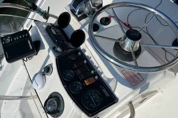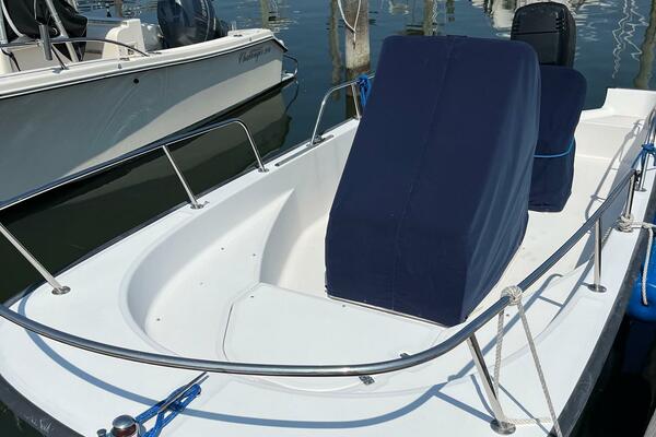 Forward there is a a bow locker with thru-hull drain. Welded 316 stainless steel bow rail and side rails. Forward on the center console is a cushioned cooler seat. The console features two access doors, a stainless steel steering wheel, a Plexiglas windshield, a stainless steel grab-rail dash panels and instruments. The pilot seat is reversible back and cushion.