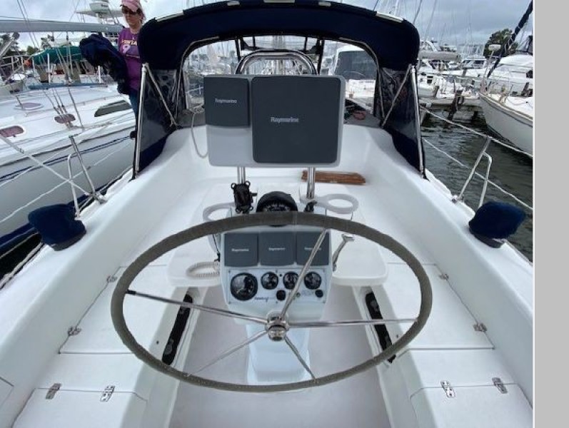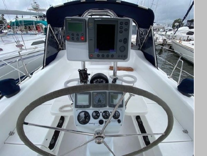 The large cockpit, with Edson Diamond Series pedestal, fitted with custom fiberglass instrument housing, integrates all navigation and engine displays. The almost 9 foot seats on port and stbd. are unique in a yacht this size.