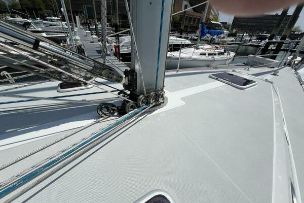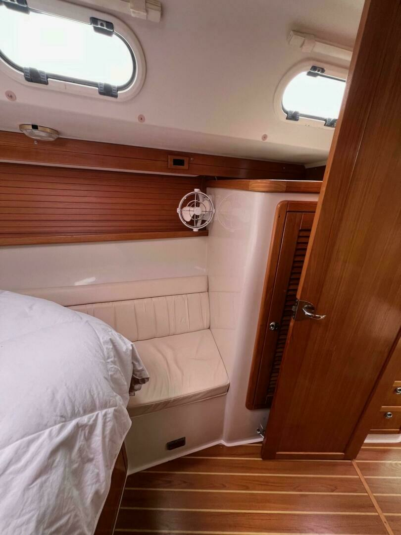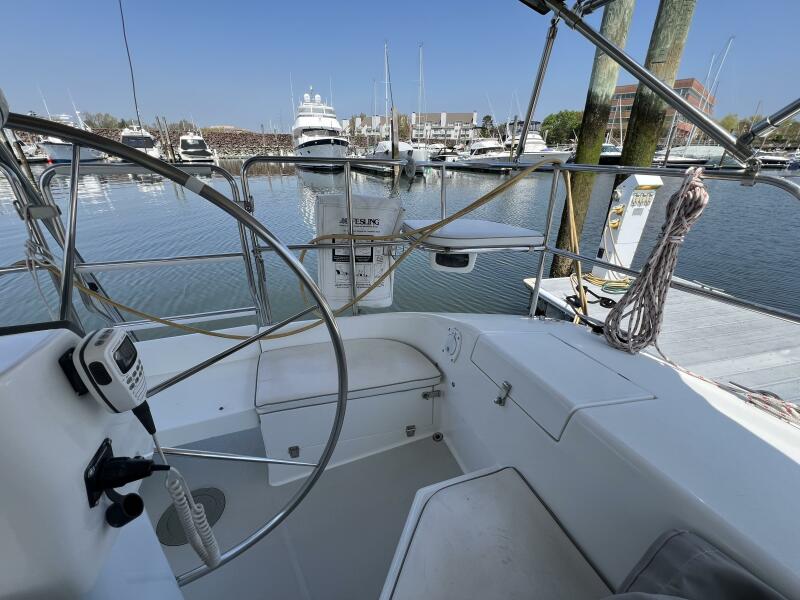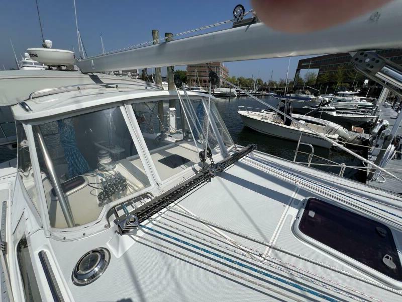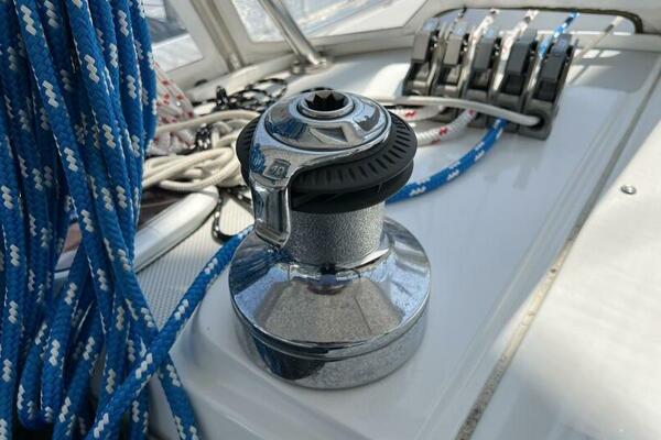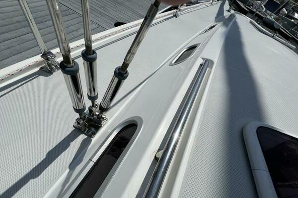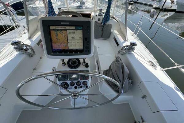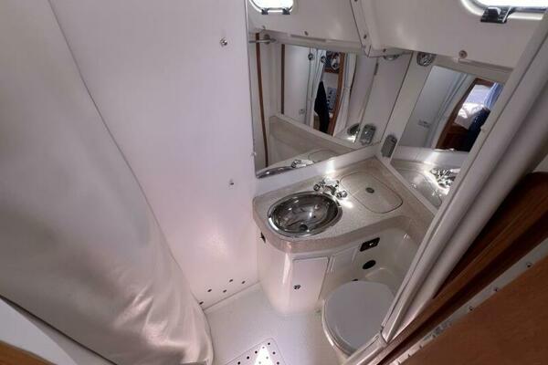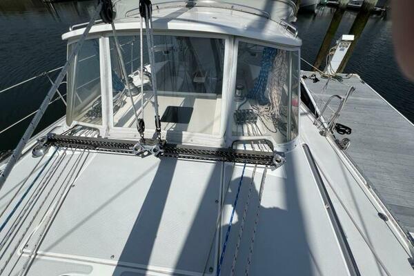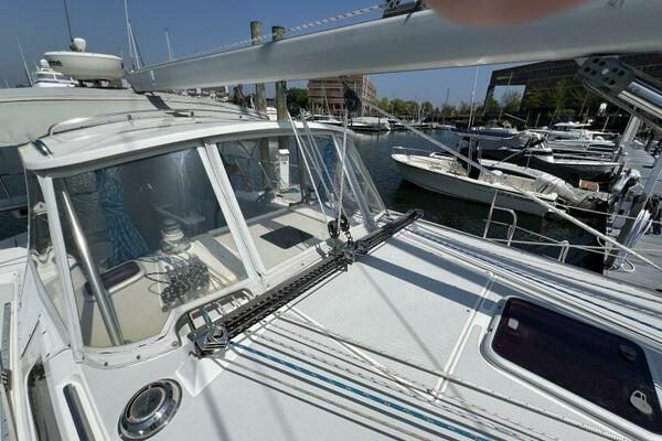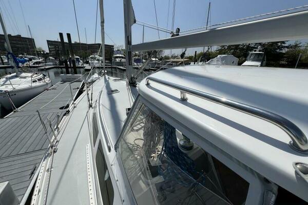 Two requirements of the 42 Mk II according to Gerry Douglas, designer, "were that the shape have lots of volume but still be slippery." With a 3-cabin (master V-berth with queen on centerline), 2 head layout and European-influenced cockpit and rounded stern, SERENITY TOO is comfortable at sea or at rest. She offers good natural light and ventilation, storage space and a thoughtful layout. The Seller has made several improvements such as adding air conditioning in 2007 and then replacing in 2017, upgrading to electric toilets, replacing the generator in 2016 and running rigging in 2023. The hardtop dodger and canvas bimini and filler piece provide shade and comfort from the elements. Furling main and jib, bow thruster and electric winch make short-handed sailing easy. YANMAR 56 hp engine and FISCHER PANDA generator provide power to spare.