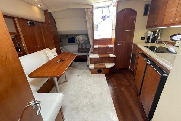 Topside, the Cruisers 400 Express is perfect for enjoying quality time on the water with friends and family. From the double helm seat and companion helm lounge to the large wrap-around cockpit seating aft, all on board will have plenty of space to stretch out and enjoy the ride. And, state-of-the-art technology and ergonomically designed controls at the helm will make driving this beauty a pleasure. She also offers convenient foredeck access with a cabin walk-around and molded-in steps to a walk-through windshield. The standard integrated swim platform, sunlounge/table, cockpit shower and cockpit refrigerator or ice maker will be welcome amenities on warm summer days. A Bimini top guarantees shady places for a nap and a camper top and side curtains will keep everyone out of the elements. Below deck, the salon area features a convertible dinette/sofa, a ventilated skylight with screens, a stereo with single CD player and helm remote, a 6-disc changer and a flat-screen TV with DVD. The full-service galley has all the appointments necessary for live-aboard cruising, offering a large refrigerator/freezer, a microwave oven and plenty of work space and storage. The forward stateroom area incorporates a large island berth with easy access from either side, spacious lockers and a ventilated skylight with screens. The shower compartment is separate from the head; they occupy spaces opposite one another just aft of the forward stateroom, which also has private access to the head compartment. The primary layout features a comfortable settee/sleeper in its amidship cabin area, lending to the open feel of the salon. A second head lies just to port of the settee, with a sink and vanity located outside the head compartment door for increased convenience if overnight guests will be using this space as overnight accommodations. The alternate layout features this area enclosed entirely behind a bulkhead and a door, located to port of the companionway, which creates an aft cabin.