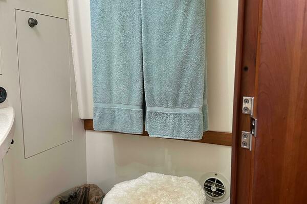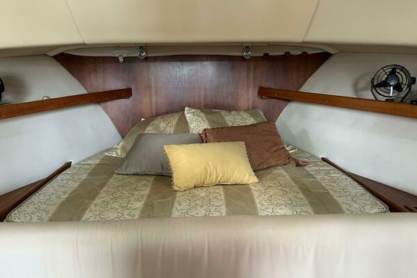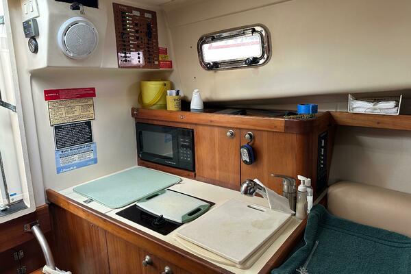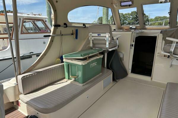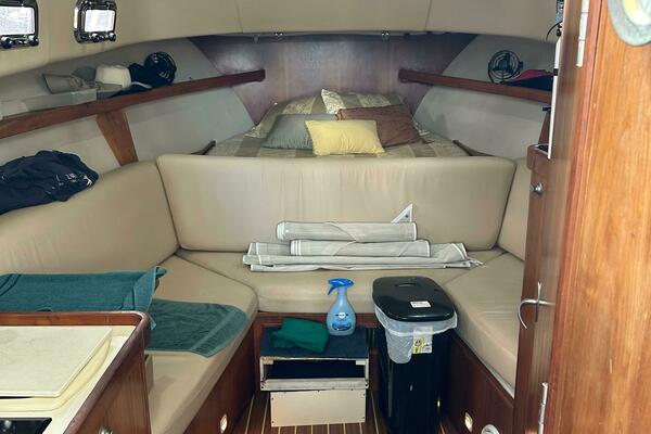 The cabin has a V-berth/dinette forward which folds in half when not being used, a good-sized head, and a teak-and holly cabin sole with a cherry interior. There is new drop in refrigerator that was installed in 2025 and the cabin and helm area have air conditioning.