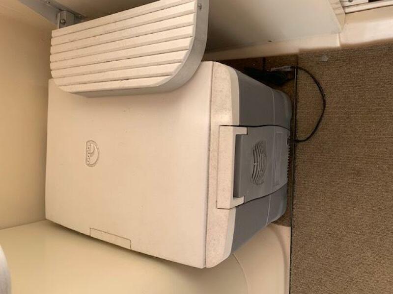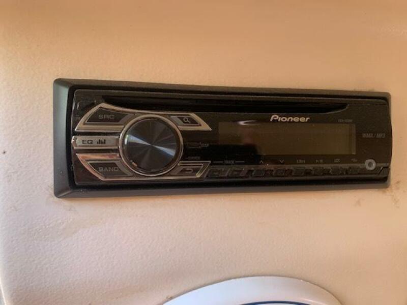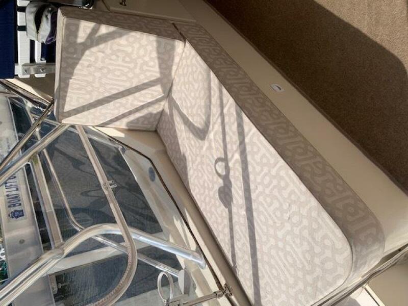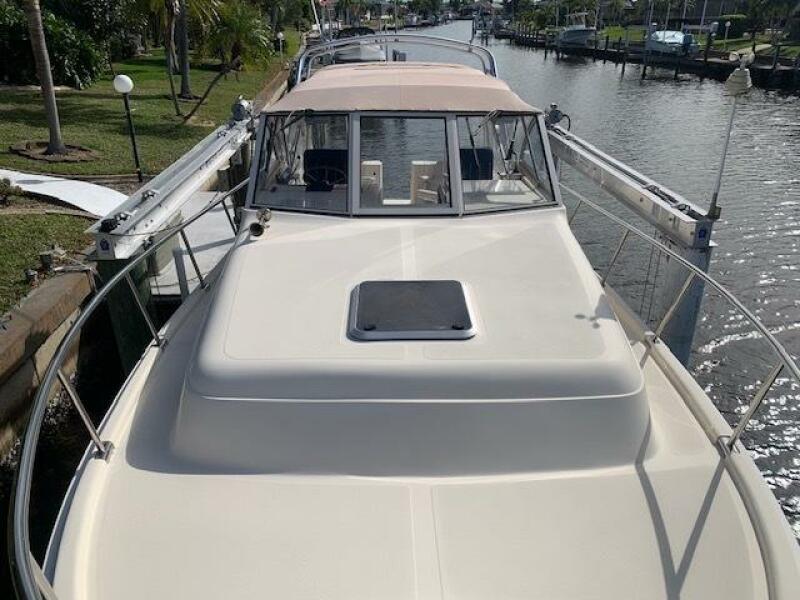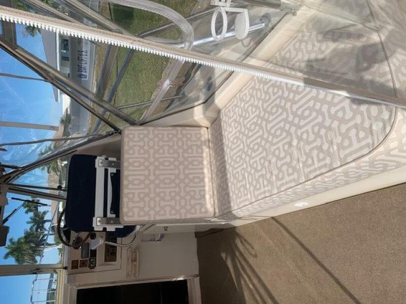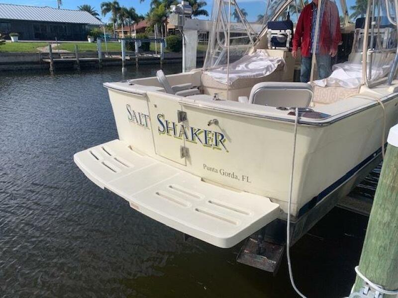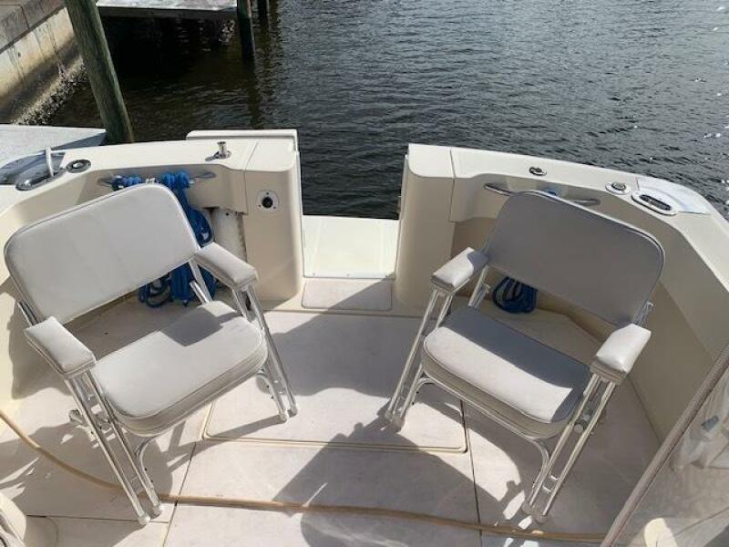 Yanmar 315 Diesel Engine; Antique white gel coated hull and swim platform; Antique White deck and cockpit; Tan bimini top and enclosure; Custom Captain Blue exterior seating; w/ gold & burgundy stripes; Gold Rum Runner II embroidered logos on helm seat backs; Rum Runner II Logos on the deck sides; Custom Brisa Golden ultra leather interior seating; Ocean Aire deck hatch screen and shade combo; 15" flat screen TV with stereo, CD and DVD player; Air conditioner with reverse cycle heating; Bow thruster with black bottom paint; Dripless shaft log; Lounge seat backrests; Oil exchanger system; Radar arch; Stainless steel bow cover; Stainless steel aft hawse pipe chafe rope guards. Additionally, this owner has fashioned storage boxes below each helm seat and has added extra thick cushions to the lounge seating.