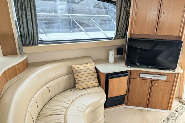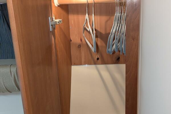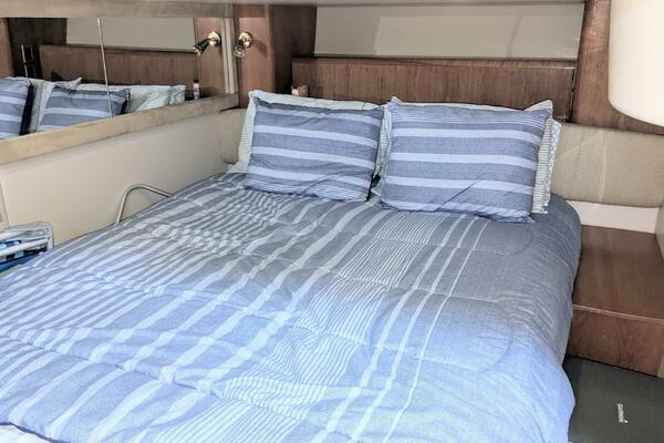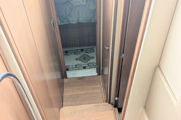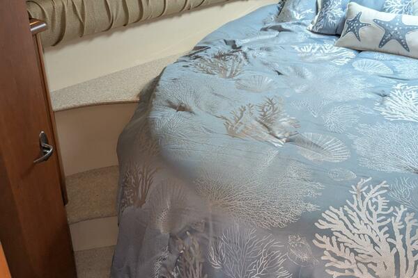 - Owners’ Stateroom Forward with pedestal queen berth, TV, hanging lockers and drawers – great storage