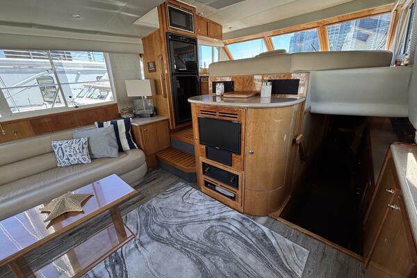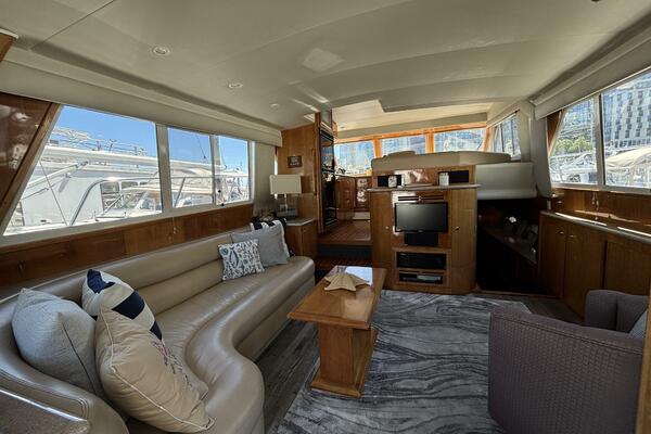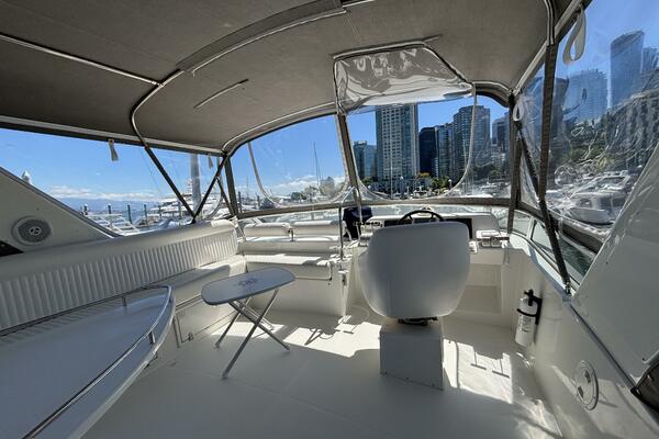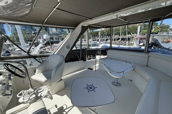 Her spacious flybridge includes a dining table, centered helm chair with near-new vinyl cushions. She offers generous storage with a well-designed, exceptionally accessible engine room for easy access to mechanical systems.