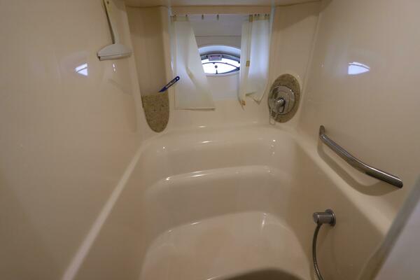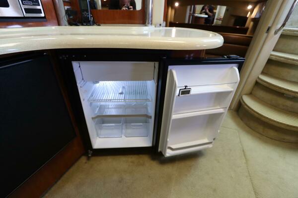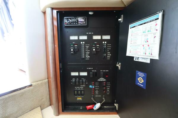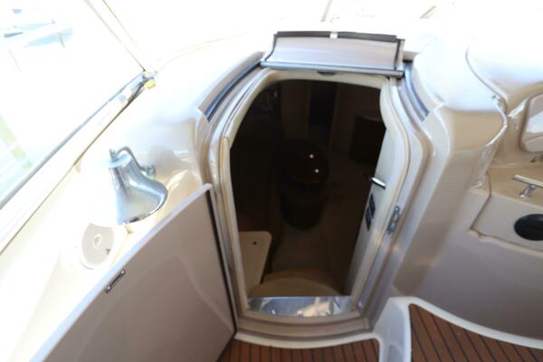 Yet another Sea Ray sales success story, the 420 Sundancer (called the 44 Sundancer in 2006–08) set the gold standard for express yacht styling and luxury during her production years. Her bold styling compared well with the best Mediterranean sport cruisers of her era, and a large cockpit and spacious interior made many of her European counterparts seem small in comparison. Built on a deep-V hull with prop pockets to level the engines, the luxurious two-stateroom, two-head floorplan of the 420 Sundancer is an impressive blend of high-gloss cherry joinery, Ultra leather seating, and designer fabrics. Privacy doors separate both staterooms from the salon, and the Sundancer’s full-service galley includes an under-counter refrigerator/freezer in addition to Corian counters and hardwood flooring. Topside, the entire cockpit sole can be raised at the push of a button for engine access. An extended swim platform, split forward head compartments, transom storage locker, and underwater exhaust system were standard.