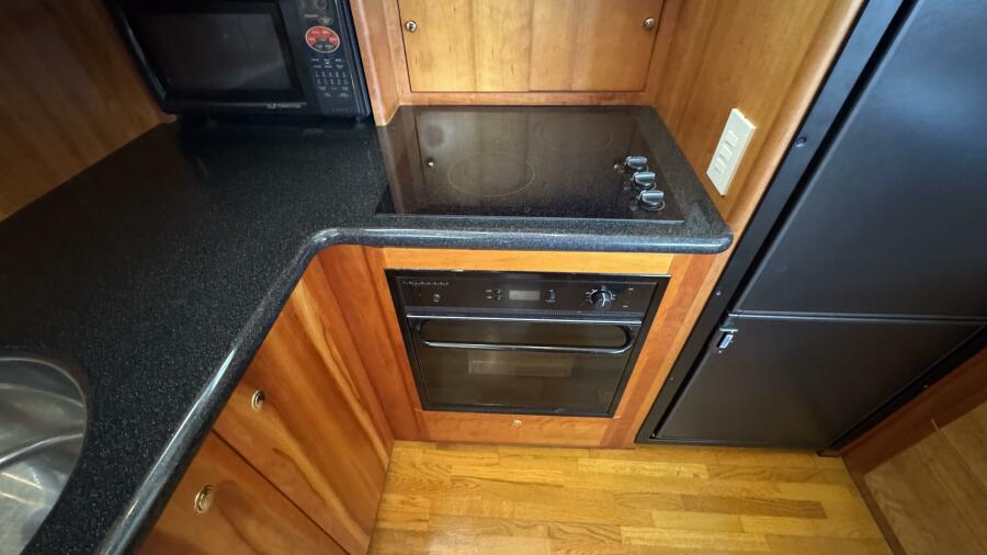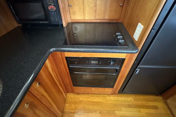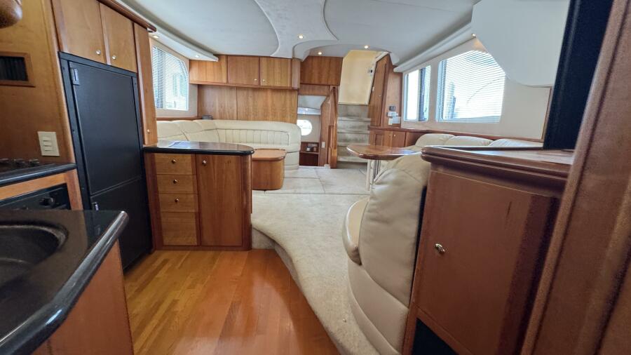 Forward, the galley is starboard-side with abundant cabinetry, premium appliances, and adjacent booth-style dinette.