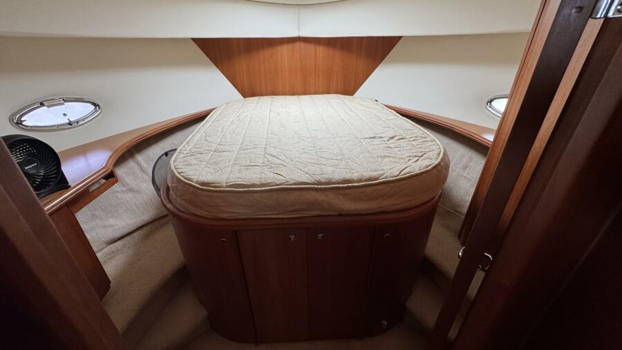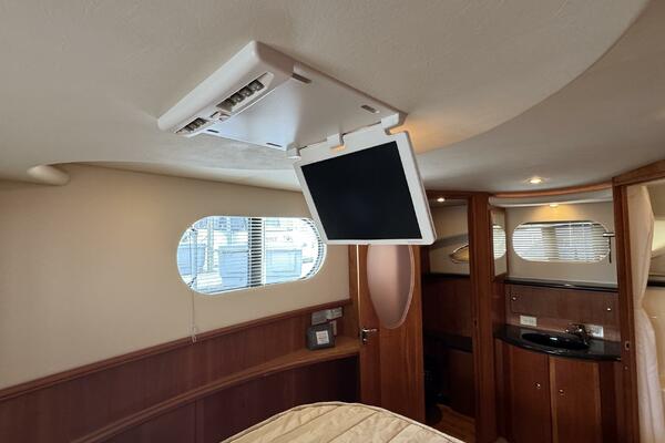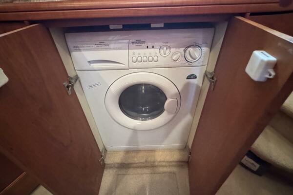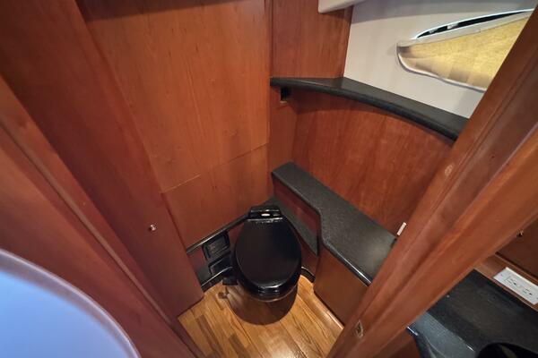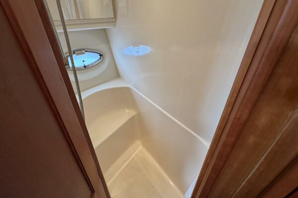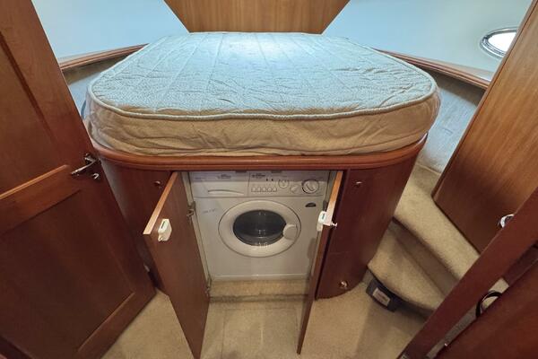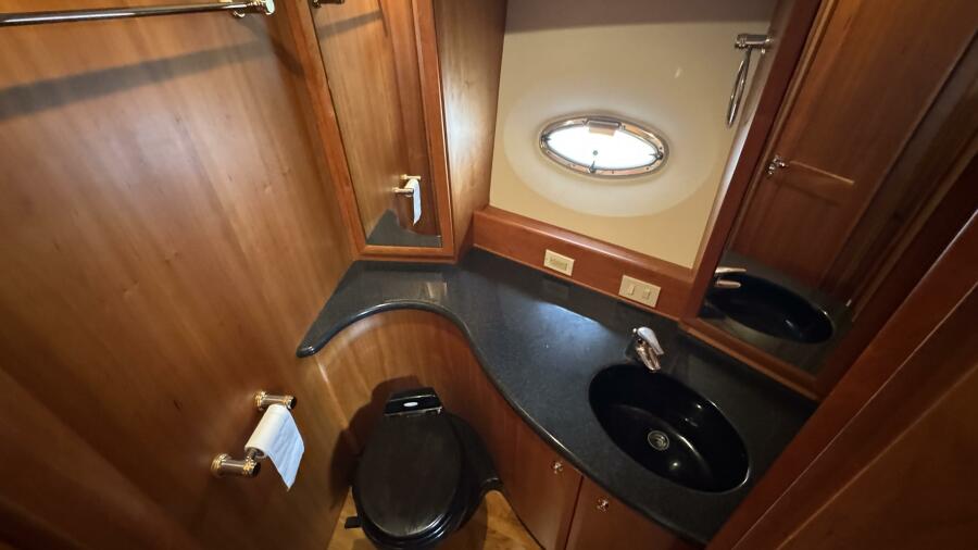 The VIP stateroom forward features a queen berth, washer/dryer combo, and private access to the guest head. The aft master stateroom offers another queen berth, excellent storage, and en-suite split-head design with a stall shower.