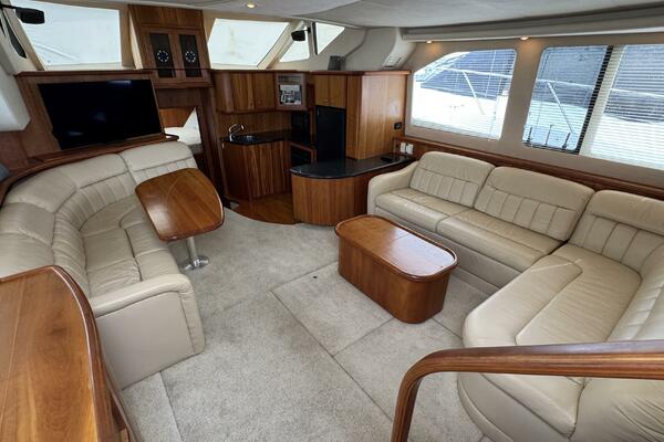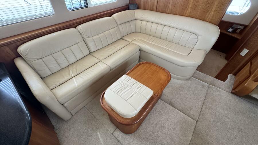 The expansive salon features cherry wood interior, wraparound panoramic windows, and dual settees (both with fold-out beds), creating a bright and inviting living space. The galley is well equipped with full-size appliances, ample storage, and adjoins a cozy dinette. Two private staterooms each offer queen berths and en-suite heads with separate showers, providing comfort for owners and guests alike.