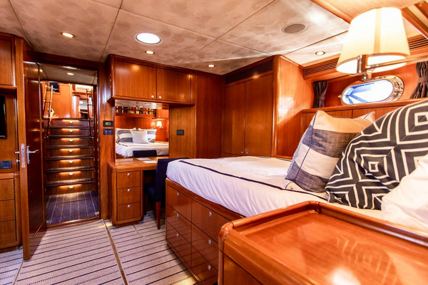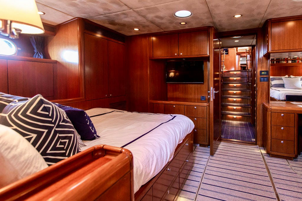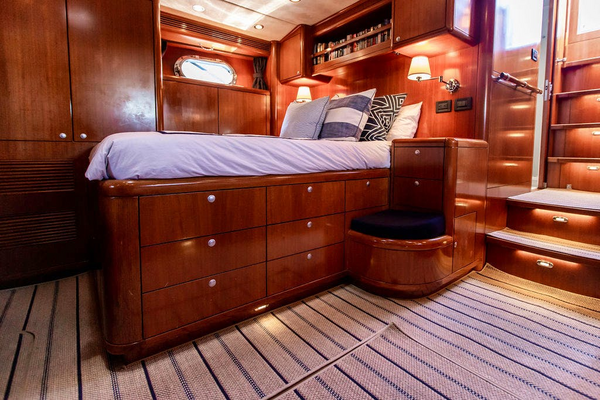 The large pilothouse, originally designed for inclement weather, becomes the social center aboard CABOCHON. It is light and airy with excellent visibility. To port is a U-shaped settee and teak table that seats six, great for informal meals, cocktails or just planning the day’s activities. To starboard and forward is the navigation area with throttle and autopilot control, complete with all electronics, nav table and helmsman’s seat. Aft of the nav area is a wet bar and coffee machine.MASTER STATEROOM