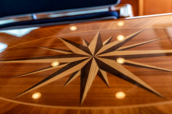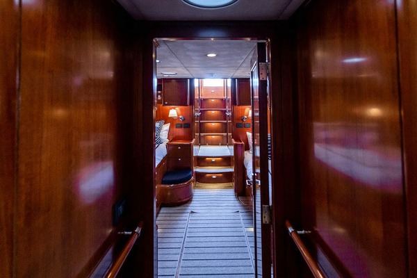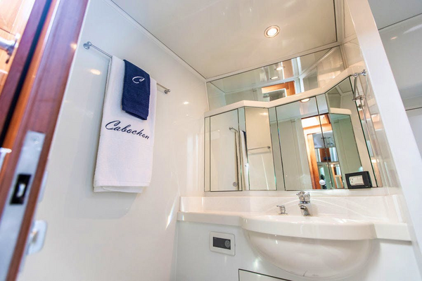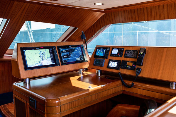 CABOCHON has accommodations for six adults and two children in the owner’s party, with three large private staterooms aft, split-level dining/lounge areas amidships, plus two en-suite cabins forward of the galley for crew. Joinery is finely crafted Euro-style teak with a gloss varnish finish.PILOTHOUSE