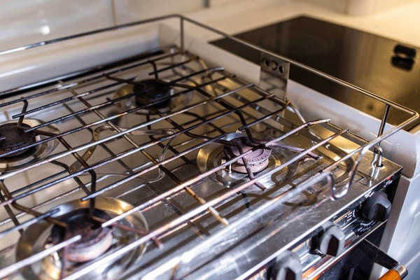 Forward of the main salon, a sliding teak door, as well as a watertight MCA door, lead to a large, U-shaped galley and crew mess. The fully equipped galley has a large hatch for light and/or fresh air while at anchor, so the running of A/C (new 2019) is often an elective. There are multiple freezer compartments to support “around-the-world” adventuring.- Broadwater 4-burner propane stove and oven