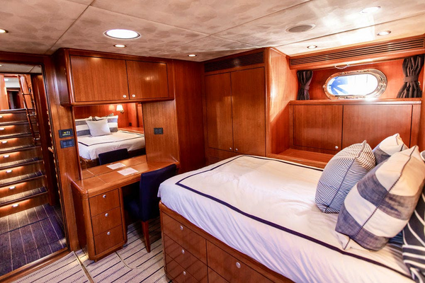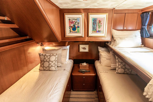 Entered from the pilothouse down full-sized easy-access stairs and hallway, the master stateroom aft has 1 king (new, 2019) and 1 queen sized berth, port and starboard, a makeup area, two cedar-lined hanging lockers, plenty of storage space and his and hers bathrooms. Port head features a bath tub while the starboard head features an enclosed shower. Opening portholes for ventilation and deck prisms for additional natural light. LCD TV with high-definition satellite and Sonos system(2018). Aft, a centerline companionway leads to a private aft cockpit.GUEST STATEROOM
