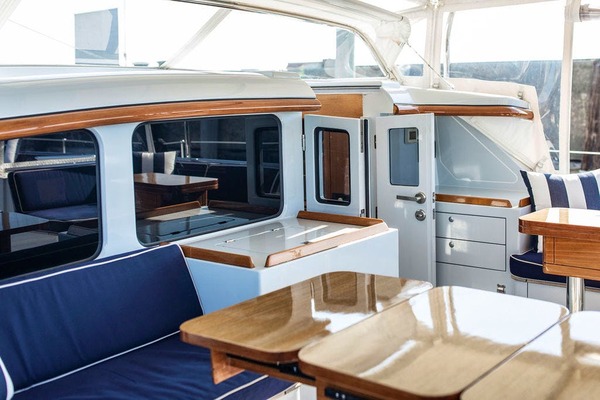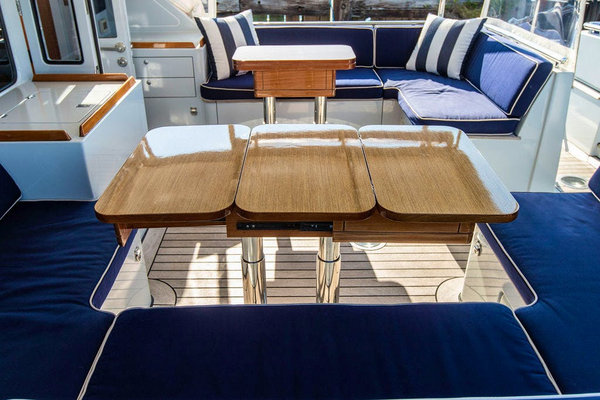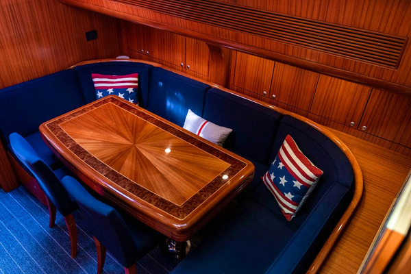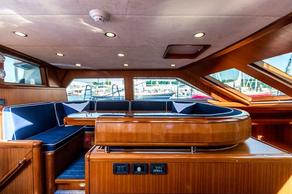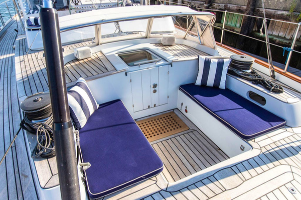 Aft of the pilothouse is the primary cockpit which can be fully enclosed and protected with a rigid bimini top, isinglass side curtains, and dodger (2019). There is a U-shaped seating area to port with a teak table that opens for cocktails or on-deck dining. Opposite to starboard is an L-shaped seating area with an additional teak table. Blue cushions with white piping (2019) complement the “Whisper Gray” Awlgrip house, teak trim and teak deck. There is a beverage fridge to port of the companionway and cabinet space to starboard. Aft of the cockpit area is the raised helm area with U-shaped settee around the 54” wheel. The pedestal accommodates navigational instruments, compass, engine controls with toggle controls for easy command and control of all sail handling. CABOCHON can literally be sailed by just one person without leaving the helm. Helm station completely redesigned and rebuilt in 2019 with engraved black face helm panel, new engine controls and MFDs which show engine data, generator start/stop controls, navigational electronics, wind instruments and PTO controlsOWNER'S COCKPIT