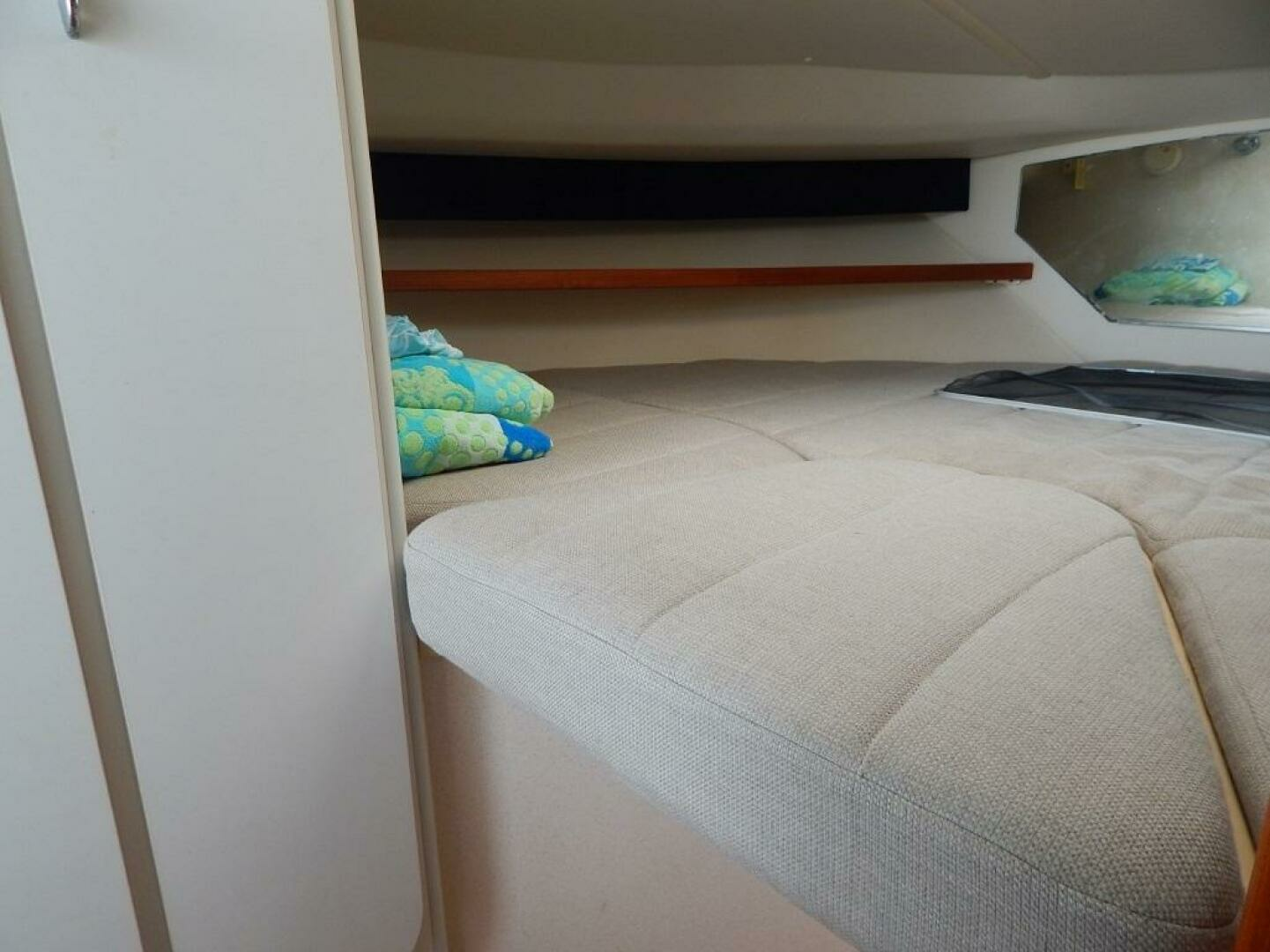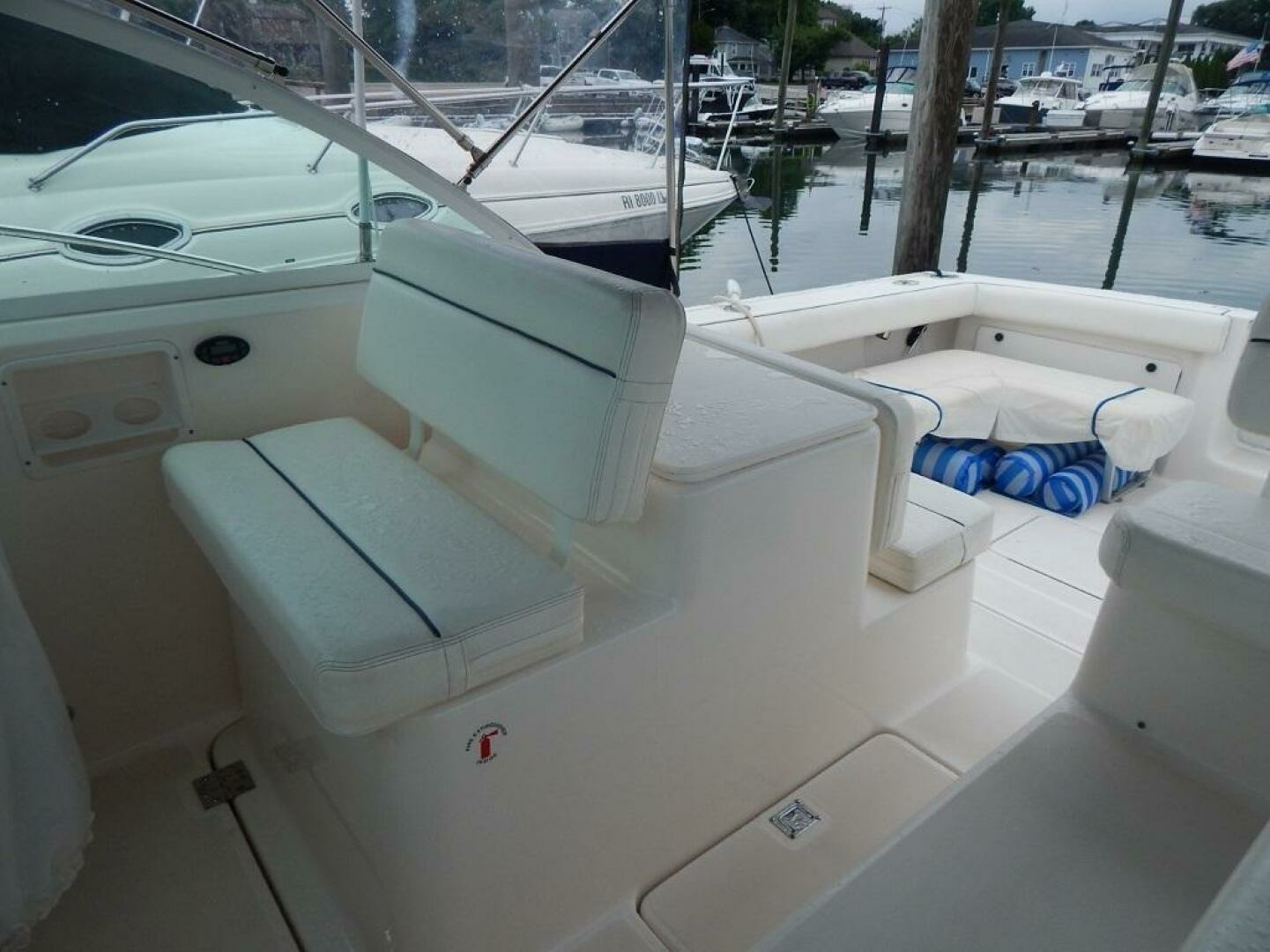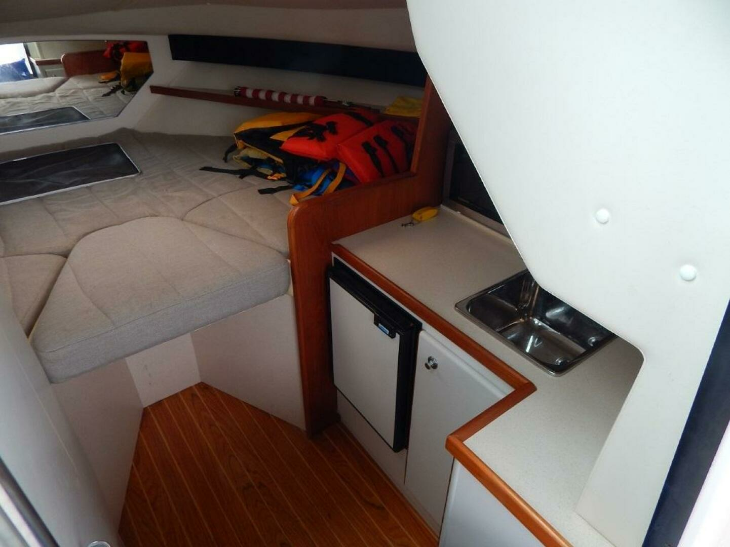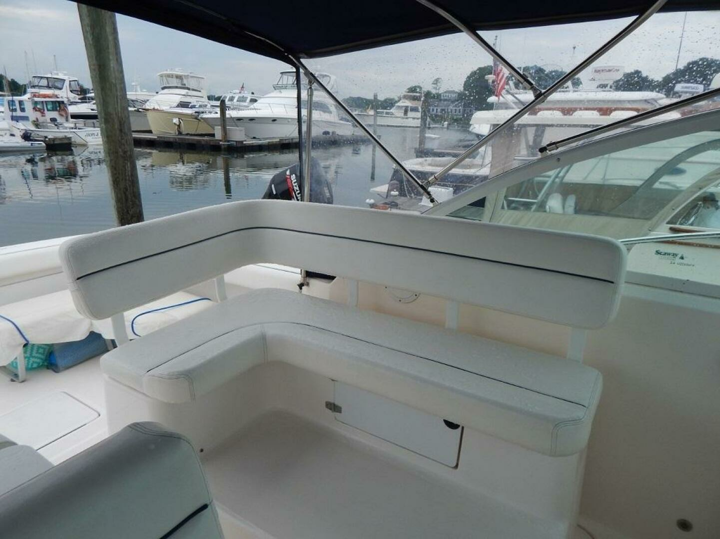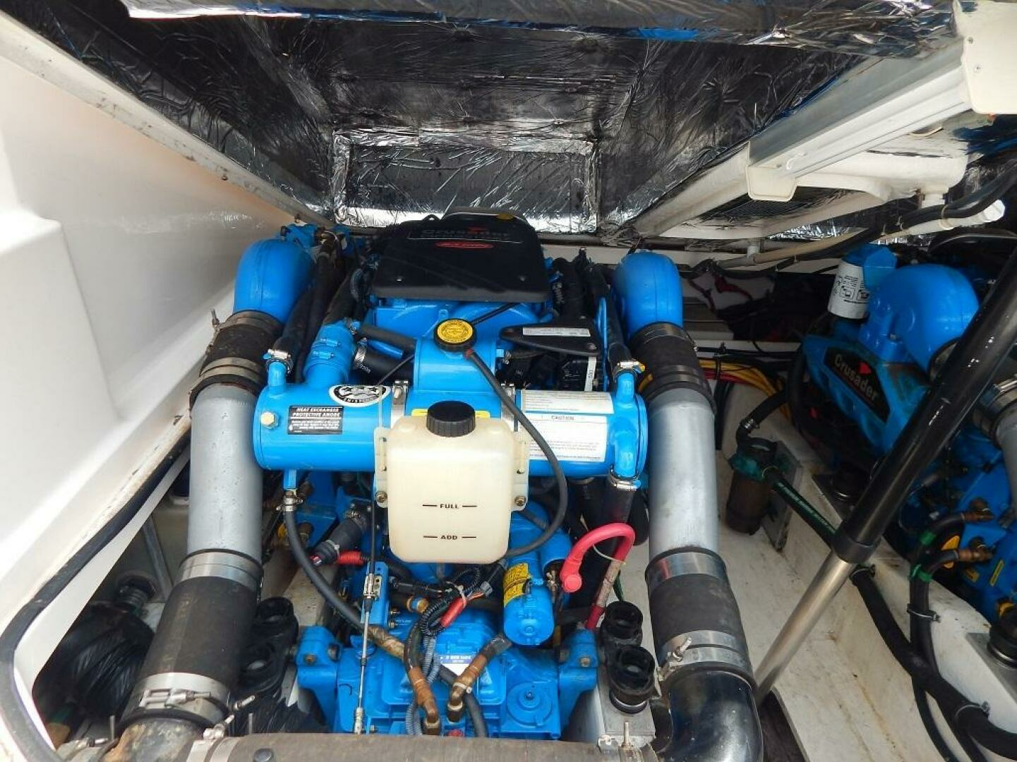 The Tiara Coronet 2900 is a good looking and versatile express cruiser with a cockpit roomier than most of this size boat. Constructed on a modified Vee hull with a wide beam and sharp bow entry. One of Tiara's simple boats she retains the high level finish and engineering excellence found in all of the Tiara product lines. The Coronets emphasis is on open air enjoyment for the whole family, and the large cockpit can seat them all. The engines are under the seat boxes and the engine hatch lifts electrically for superb access. The cockpit has a wet bar aft of the helm as well as cockpit coaming bolsters and a centerline transom door with a swim platform. The windshield is large and attractive designed with a reverse angle spray guard at the top. Below deck is a large V-berth and a small gally, teak and holly sole and a good size enclosed head. A very popular boat indeed.