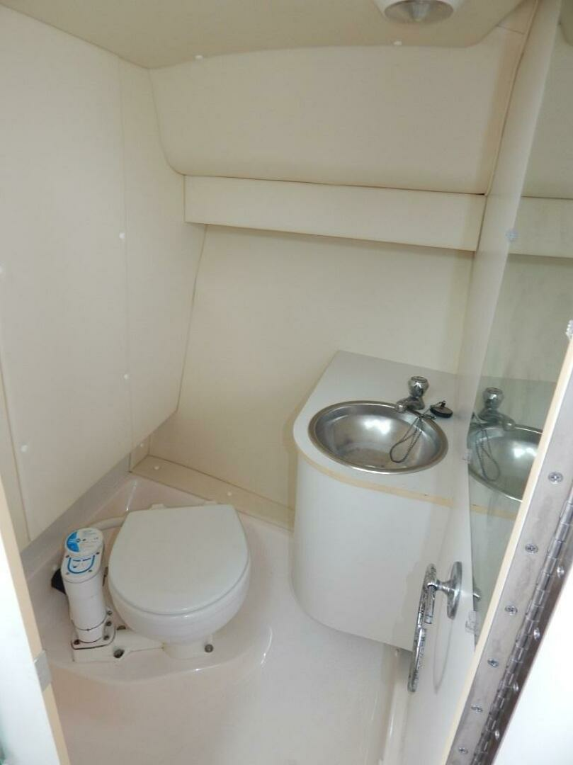 V -Berth Forward, outboard shelves, storage below and reading lamps either side, enclosed head and hanging locker aft to port and galley aft to starboard.