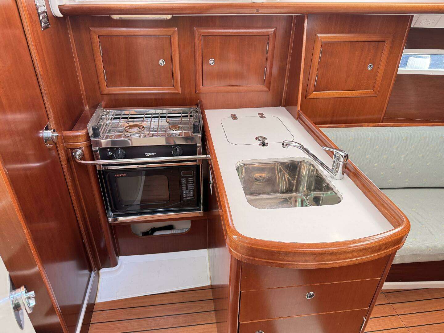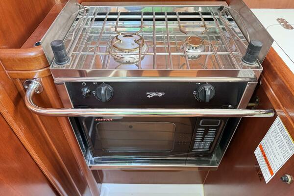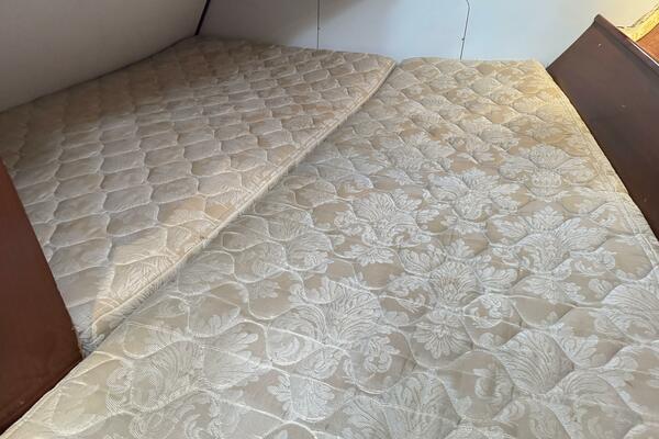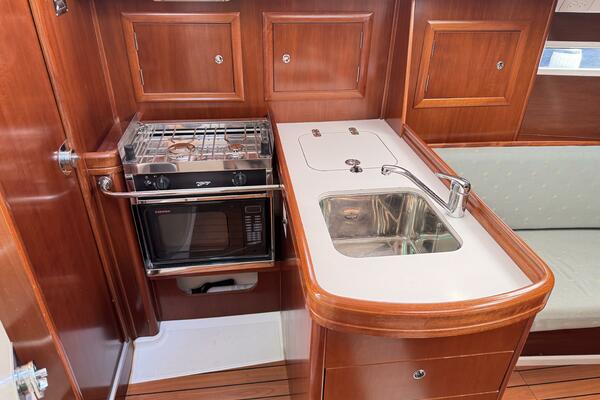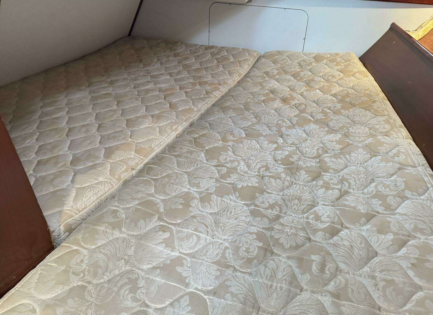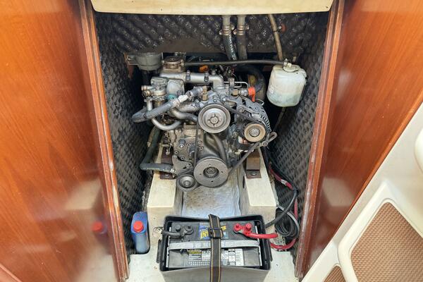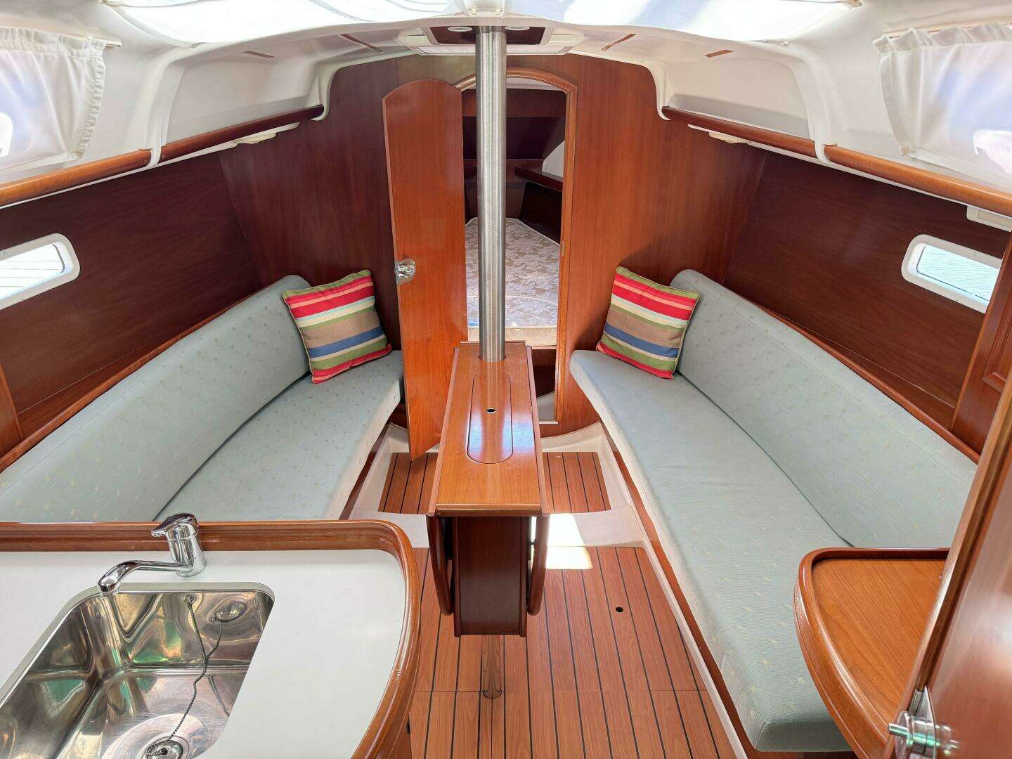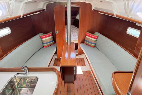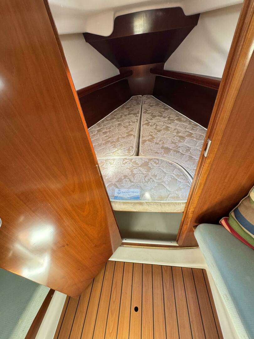 The salon has long settees port and starboard that also double as excellent sea-berths. In between the settees is a large drop leaf table. The forward cabin has a V-berth with removable center piece.