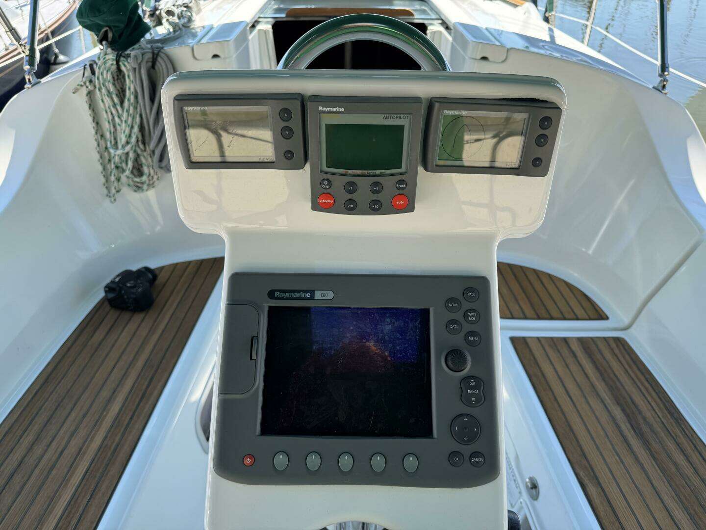 - Note: The Raymarine chartplotter functions but is old, has a bad screen and needs to be replaced (owners use an iPad—not included)
