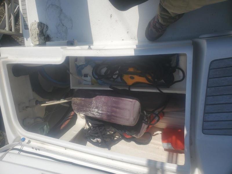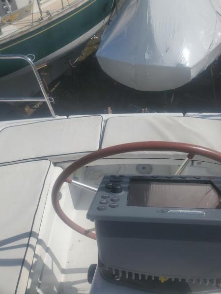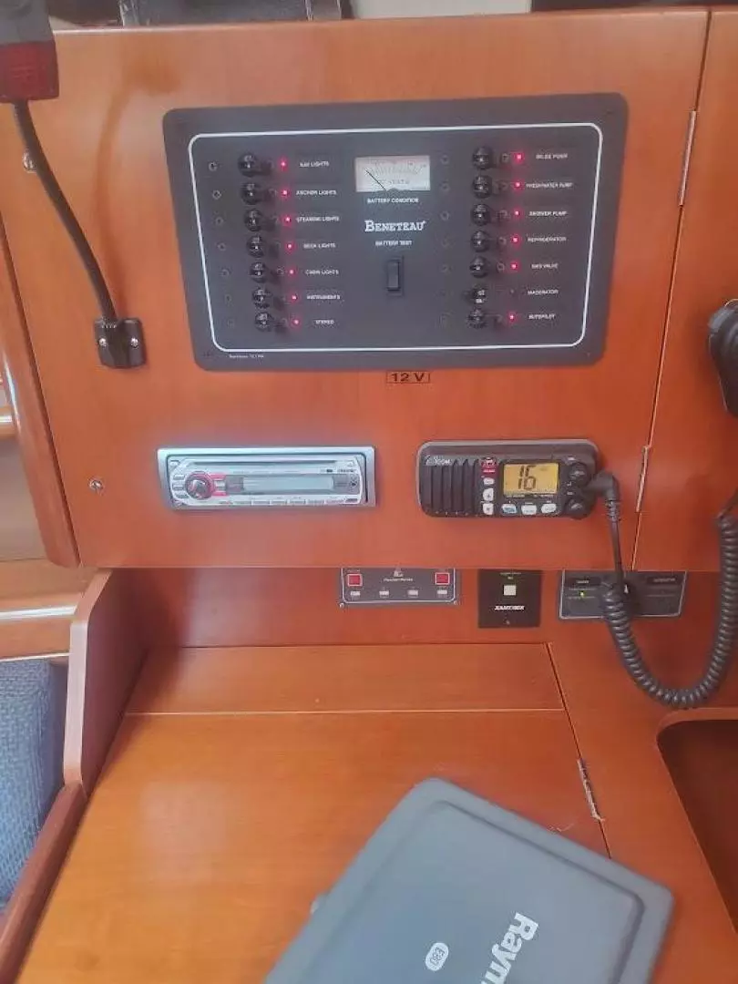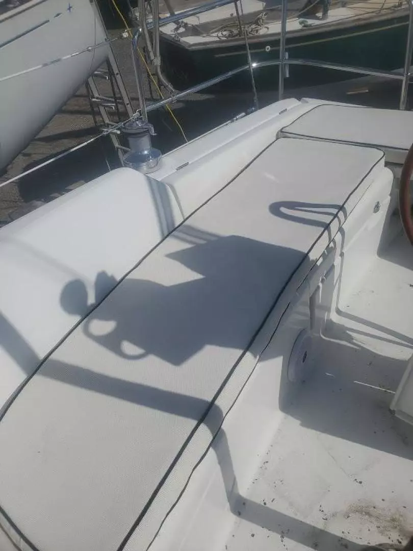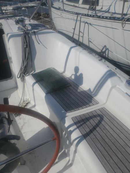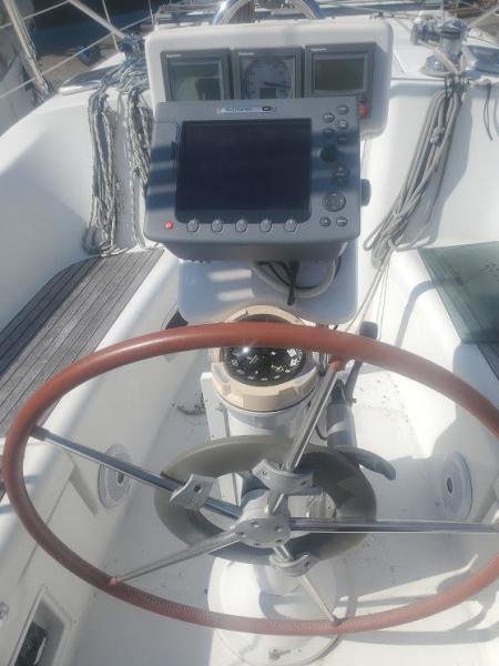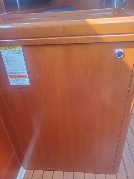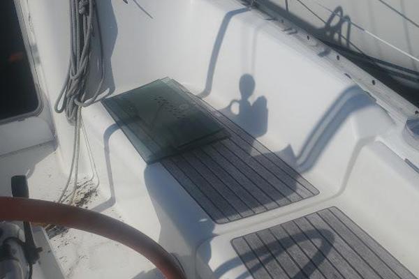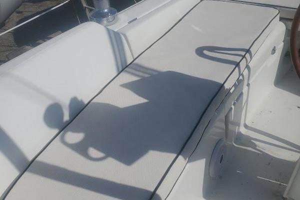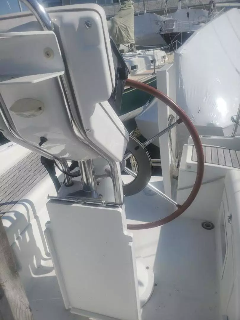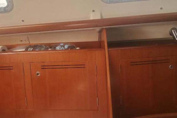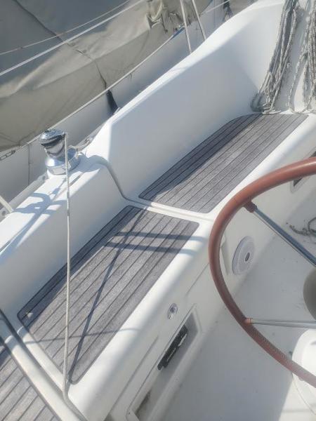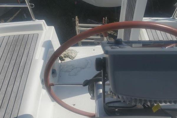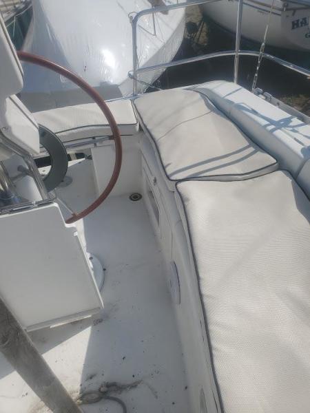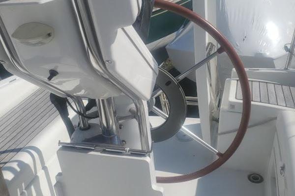 The cockpit is functional, comfortable and quite spacious. It measures 85 inches on the centerline from stern to companionway with clearance between wheel and helm seat. The wheel is mounted on Beneteau's patented pivoting pedestal that opens up to provide easy access to the swim platform. The swim platform, access is via another patented design, the swiveling helmsman's seat that lifts and drops out of the way. A hot and cold shower is also conveniently located in the transom above the swim platform. There are two large cockpit storage lockers. Cockpit seating features inlaid teak and there are cockpit cushions. There is a fold up cockpit table. The Dodger and Bimini provide protection from the wind and sun.