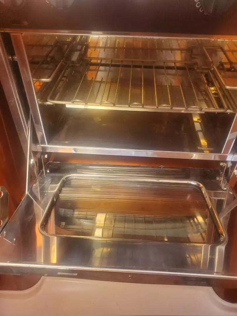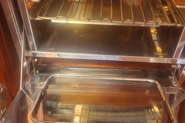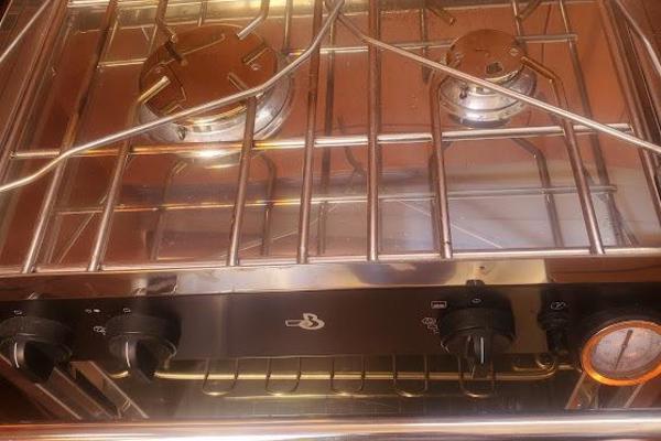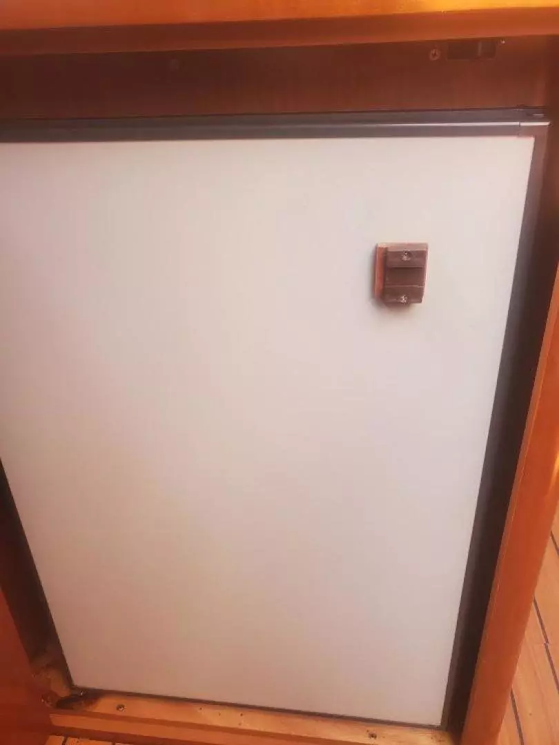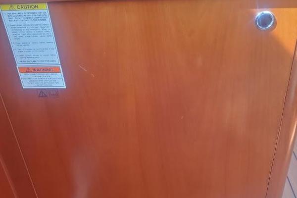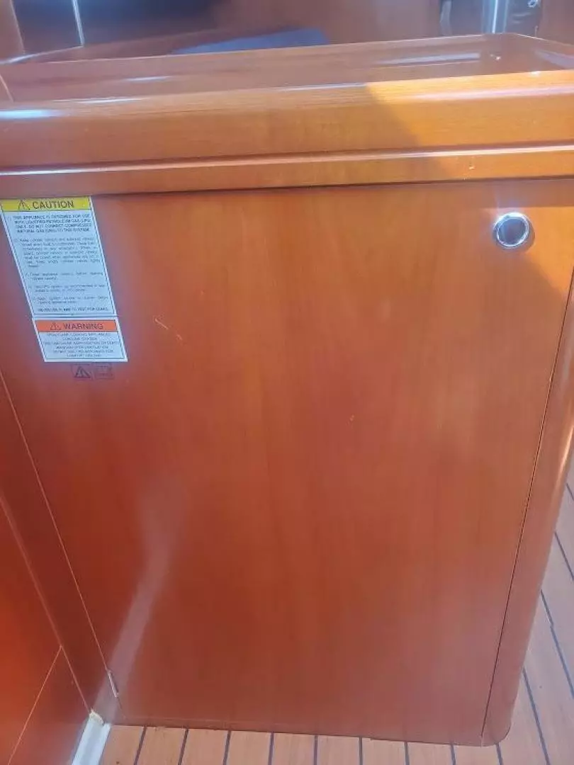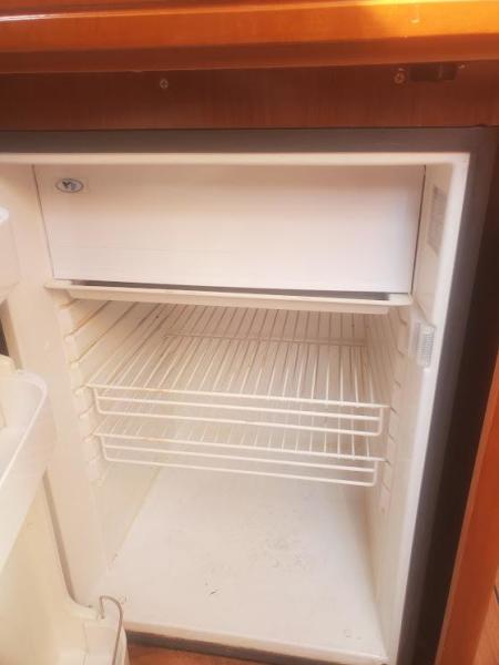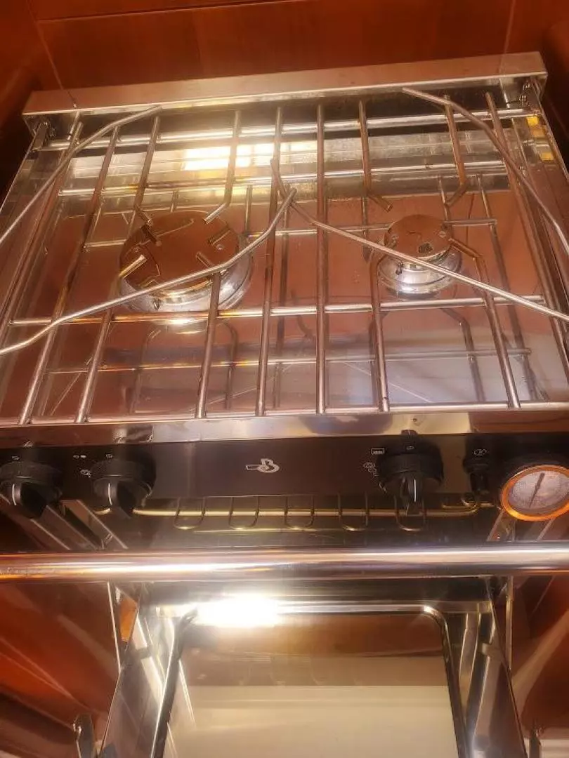 The L-shaped galley has generous 6′ 6″ of headroom. It is fitted with an Eno two-burner propane stove-oven combo and a single stainless-steel sink. The working countertop and covers a dry storage bin; a dual voltage 4.5-cubic-foot, front-opening refrigerator is below. Countertops are laminated, a plus compared to heavier alternatives, and are fitted with wooden fiddles that will easily keep small items in place. The galley has sufficient stowage space to be suitable for a week-long cruise.