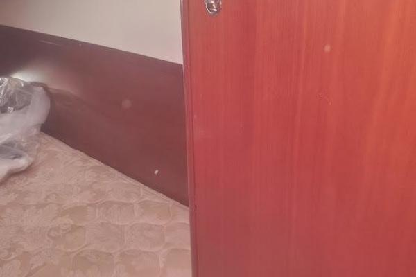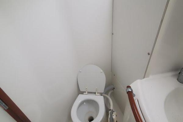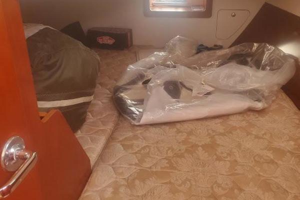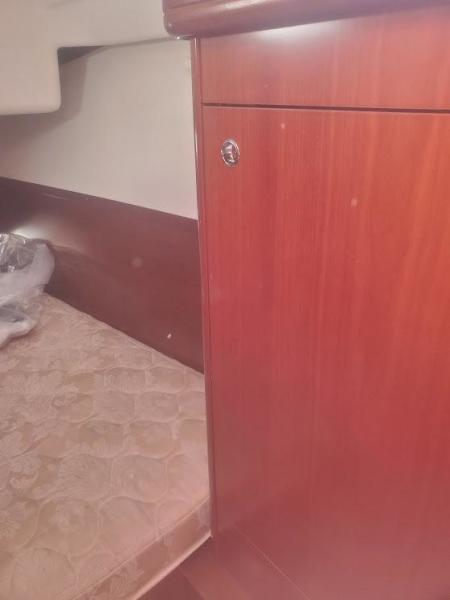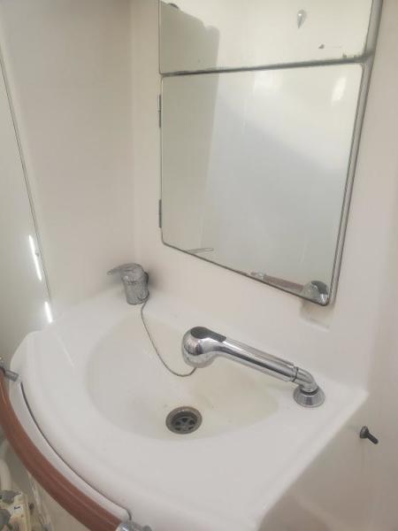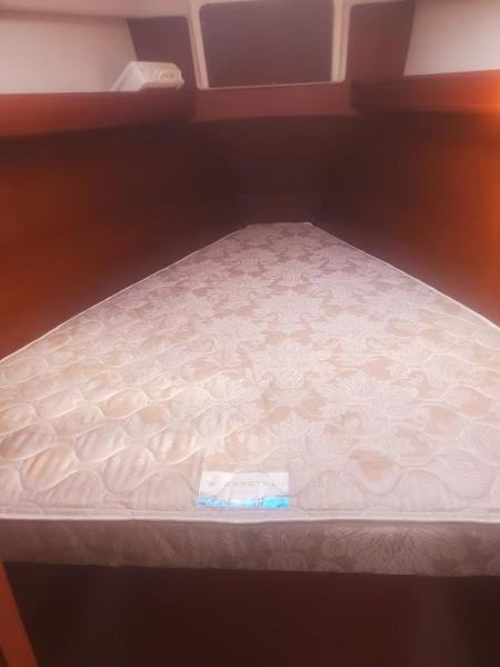The forward cabin, which isn’t a hovel, having 6’ 1″ of headroom, and a triangular double berth measuring 6′ 7″ x 5′ 5″ x 1′ 4″ at the foot. Shelving along the hull, and lockers to port and starboard provide some storage. A hatch overhead provides ventilation, and a ceiling lamp and two reading lights add illumination.