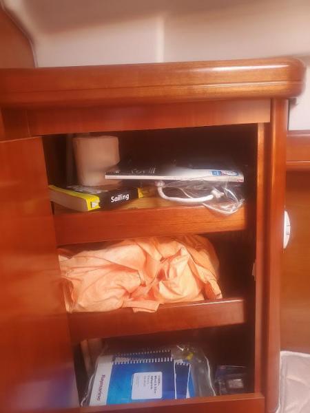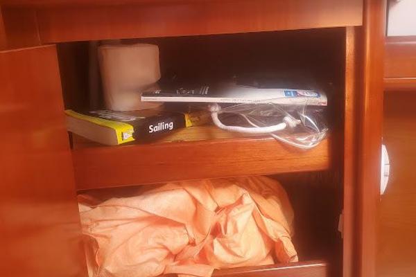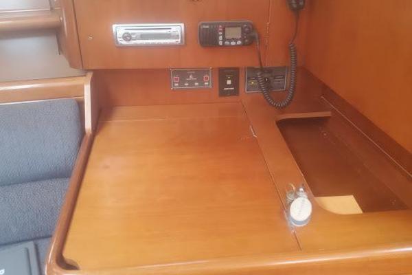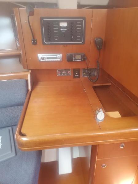 The navigation station adds a chart table measuring 26″ x 20″ that has an uncovered tray outboard for the storage below.