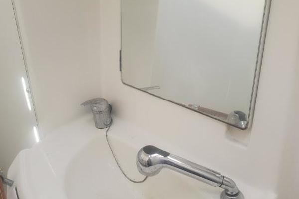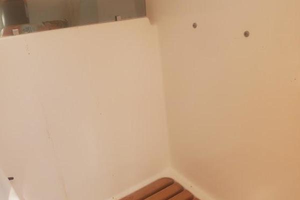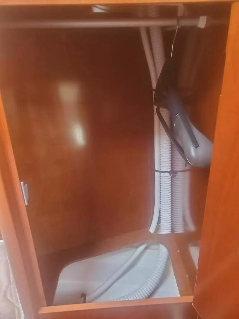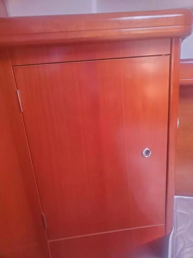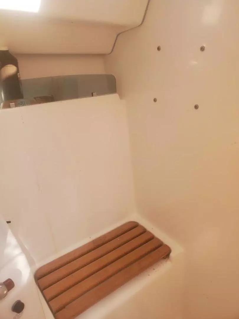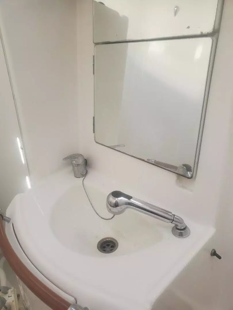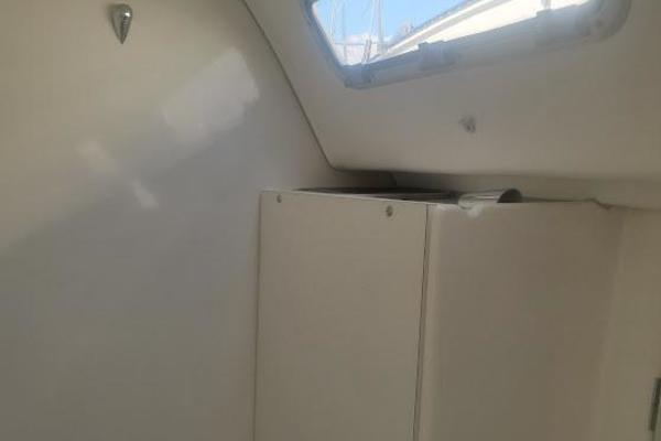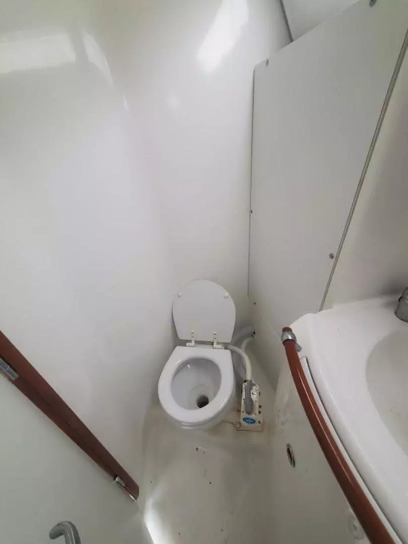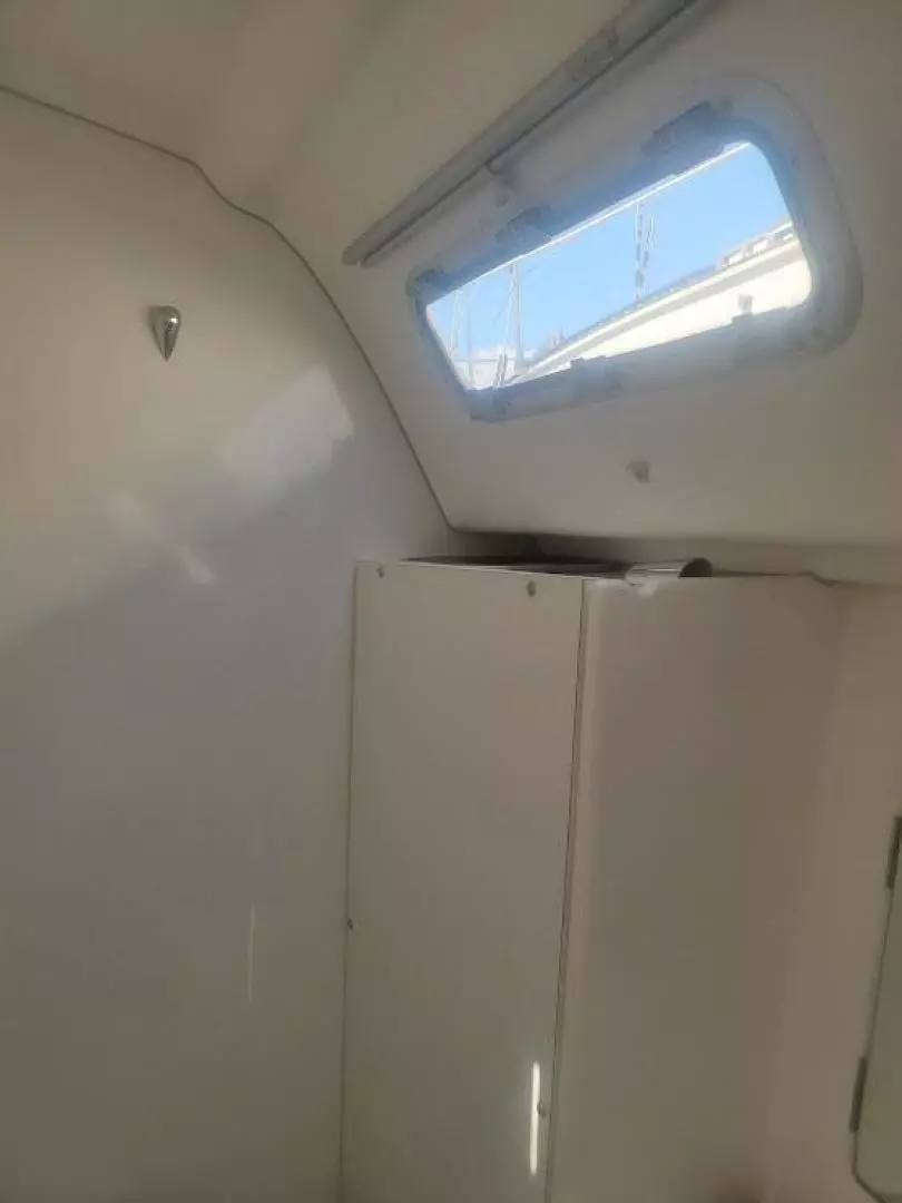 The head is the largest you will find on a 34' vessel. It is located opposite the galley at the base of the companionway steps, the perfect location. The headroom is 6 feet, 6 inches and there's a separate shower, an overhead hatch and an opening portlight. It is perfectly positioned to double as a wet locker too. A deck hatch and two ports circulate fresh air and void steam, and fitted blinds provide privacy. This head is designed to be easy to clean and maintain.