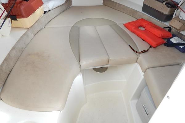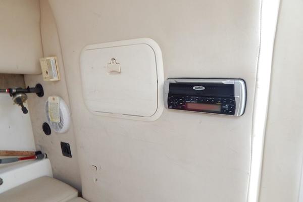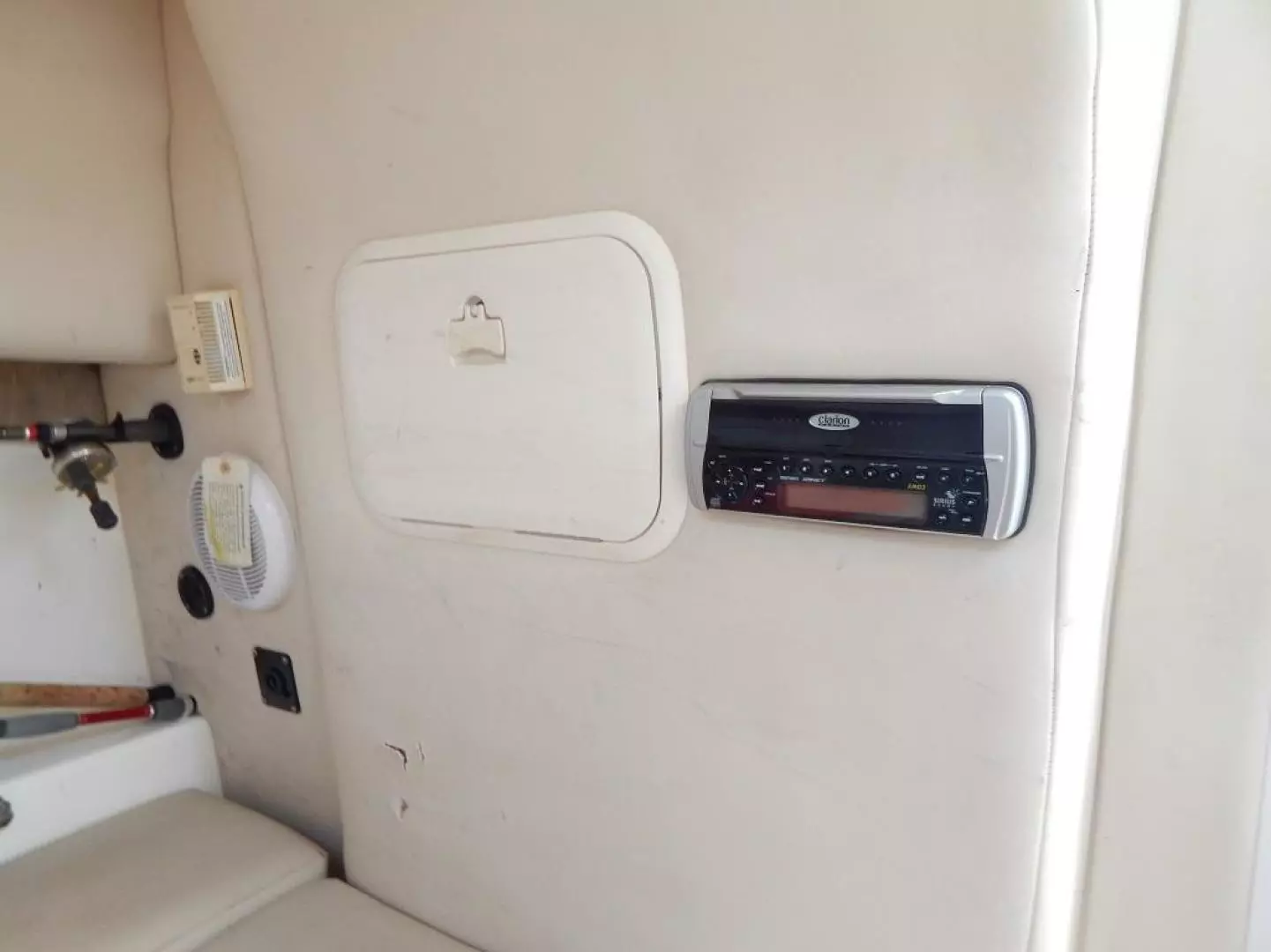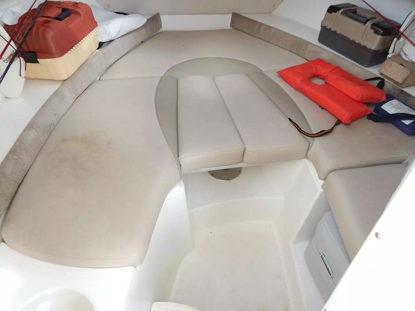 The convertible dinette/V-berth is forward with outboard storage shelves, a porta pottie to starboard and a sink to port. There are 2 opening ports and an overhead hatch with screens.