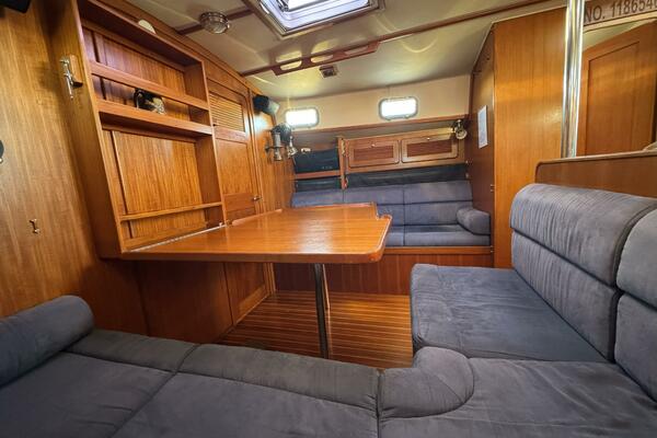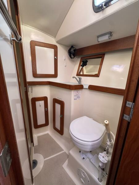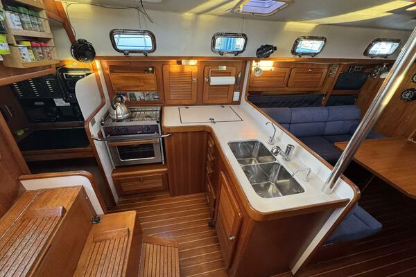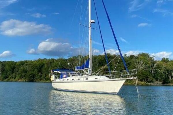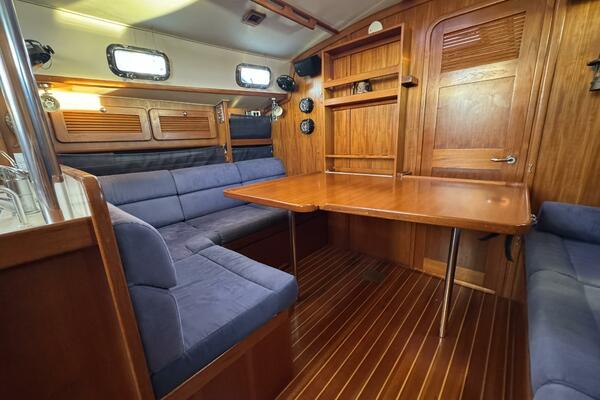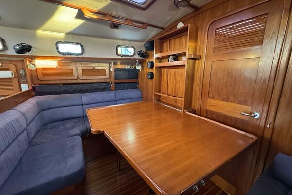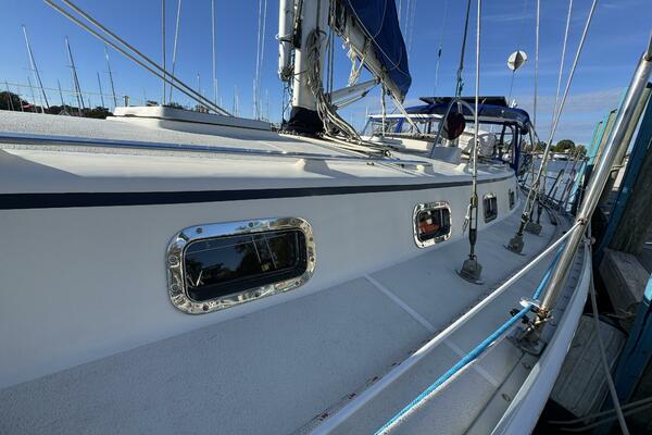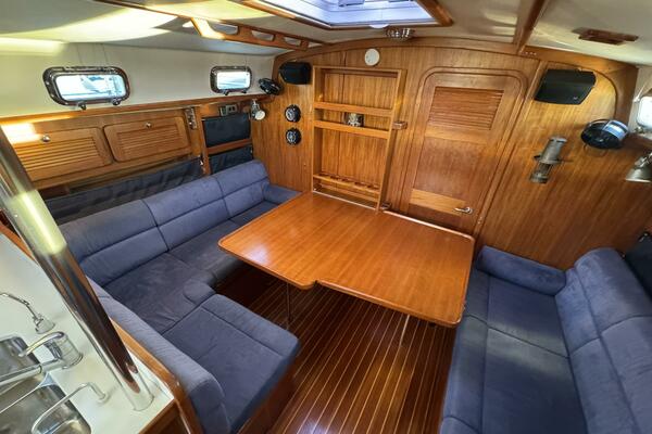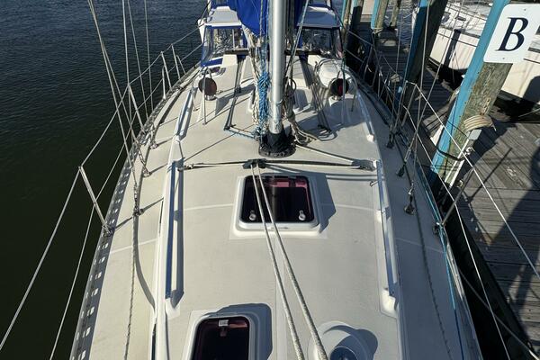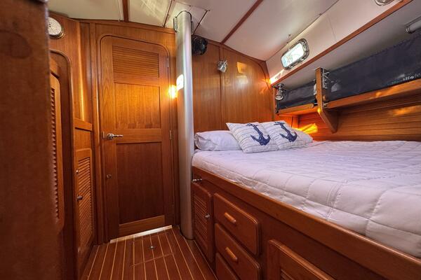 This cutter-rigged yacht features furling staysail and genoa on roller furlers, a full-length aluminum toe rail, Max Prop with dripless shaft seal, and robust ground tackle with dual-anchor capability. a forced-air Webasto diesel heater, and a full ¾ cockpit enclosure with newer canvas.