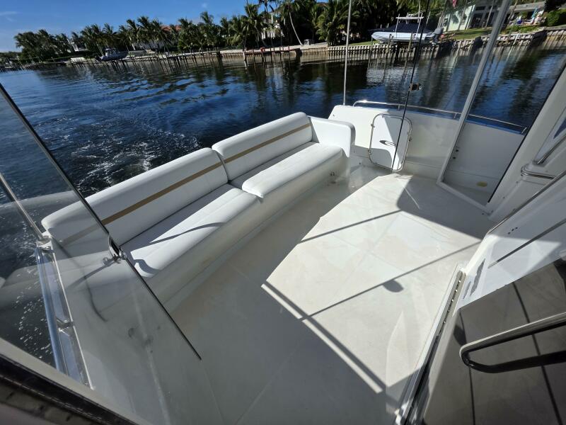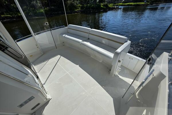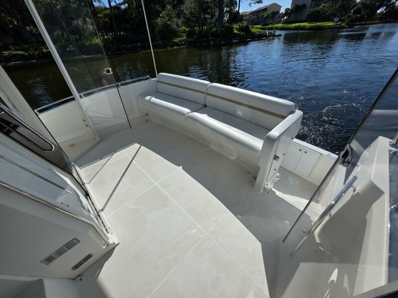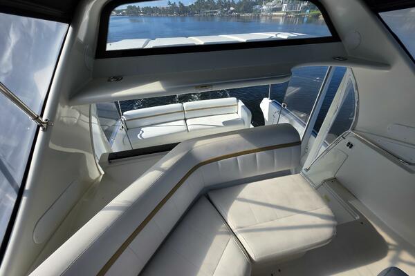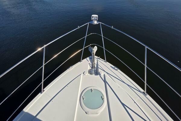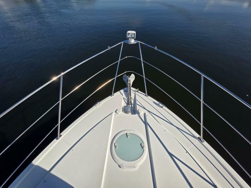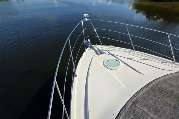 Deck hardware tends to be comprehensive: windlass with anchor, under-seat/deck storage, often canvas enclosures or Isinglass, plus custom upholstery, flooring upgrades, and bow thruster.