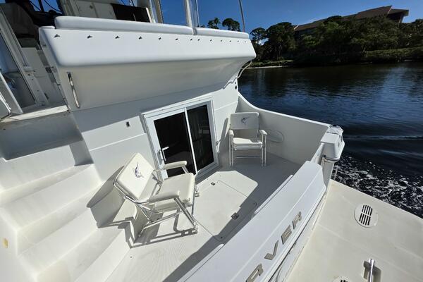 One of the defining features is its extended cockpit and swim platform, which make the yacht especially versatile. The cockpit serves as a hub for water activities (swimming, diving, launching tenders), with easy access from the master stateroom via a sliding glass door. There’s also a roomy aft sundeck/lounge area behind the cockpit, and a flybridge above with helm station, seating, often a wet bar, and favorable visibility.