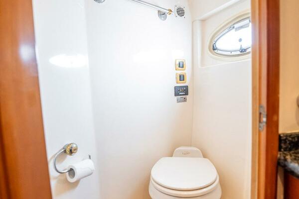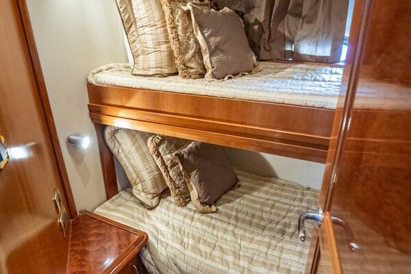 - Forward VIP stateroom with a queen island berth and private access to the day head