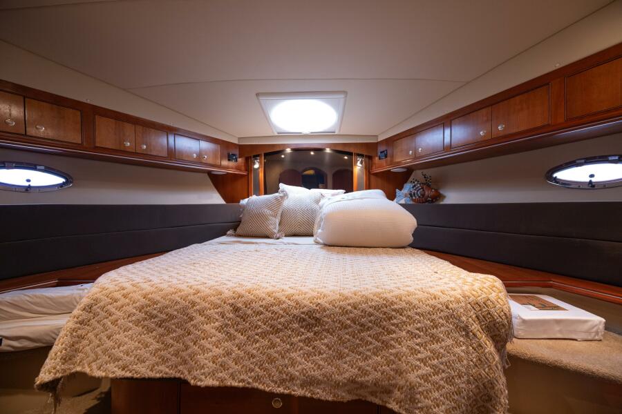 The Cruisers 455 Express Motor Yacht is an update version of the companies 4450 Express MY built from 1998 to 2003. Both boats share the same fully cored hull, the same tankage, and the same popular express/motor yacht design configuration. What is different is the exterior styling; the 455’s tiered cabin windows and restyled hardtop add much to her rakish personality. Below deck, the three-stateroom cherry wood interior is a departure from most aft-cabin floorplans in that the saloon, galley, and dinette are all on the same level. The forward cabin, with a Large cedar lined walk-in closet, is nearly as large as the owner’s aft stateroom. Note that the aft head compartment includes a tub w/shower. Topside, the tiered helm, and cockpit area keeps the captain and passengers in proximity. Helm visibility is excellent, and the side decks are wide enough for secure access to the foredeck. A well-built, twin 480hp Volvo diesels cruise the 445 Express in the low 20’s (PowerBoatGuide)