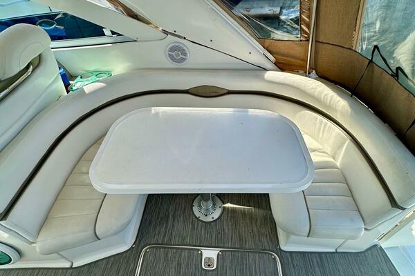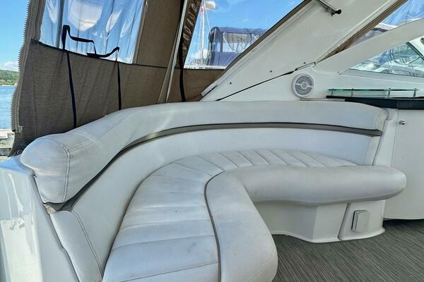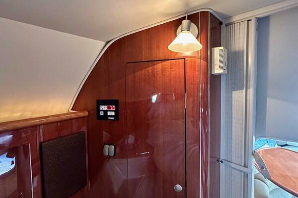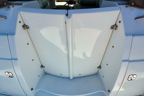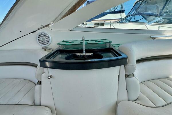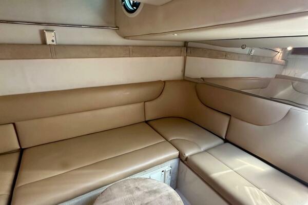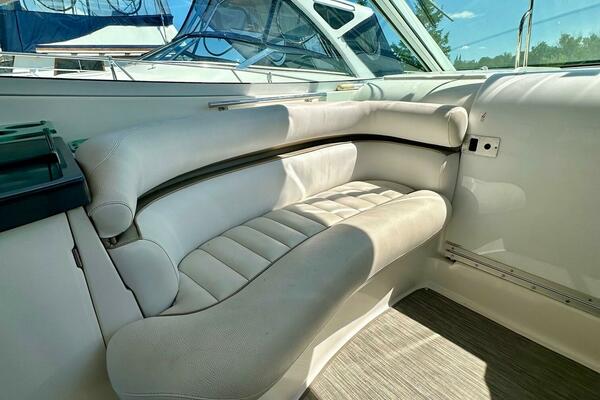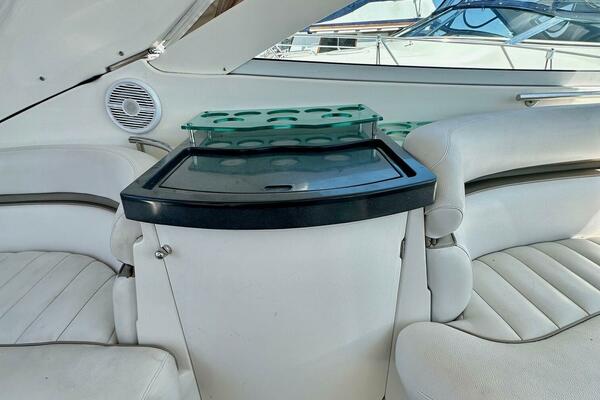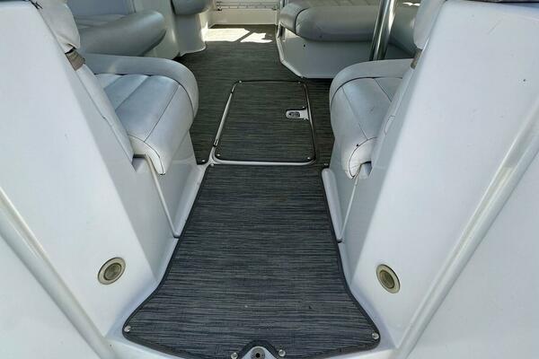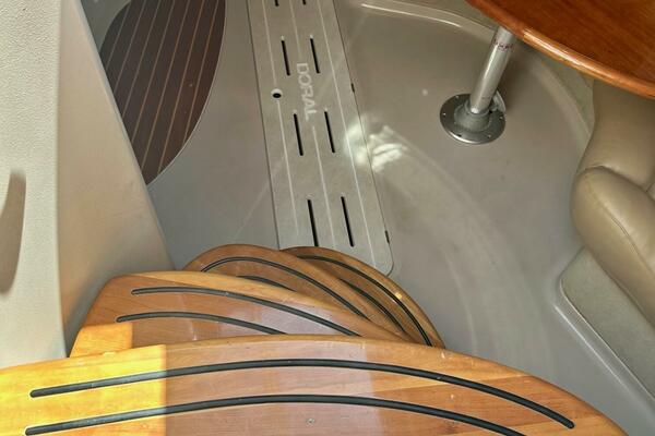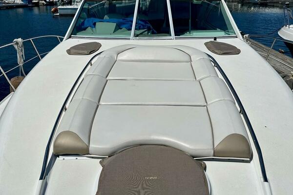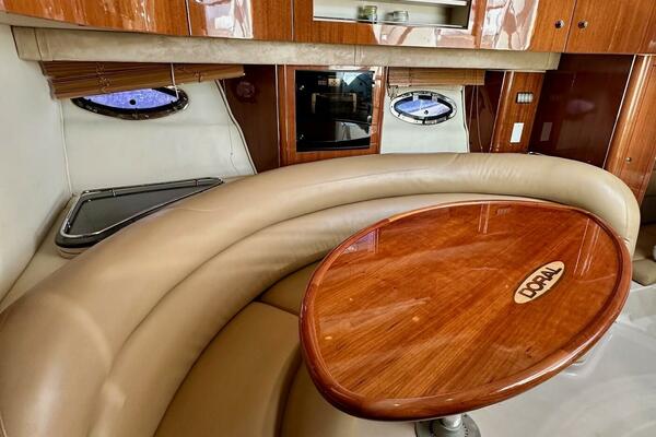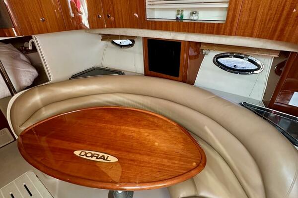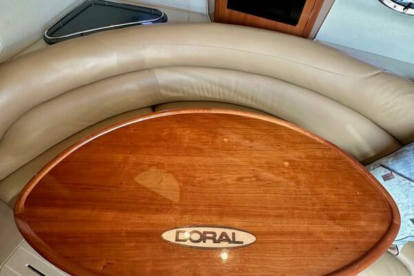 Standard features on the Doral Boca Grande include an integrated swim platform with telescopic ladder, extended welded 316 stainless steel heavy duty bow rail with extra safety line and lighted path, 8" non-skid deck walk around and a fiberglass retractable radar arch with built-in lights and night lighting. The built-in fiberglass dash featuring a wood steering wheel is specifically designed to provide easy access to information with everything at your fingertips. Some of the cockpits standard features include deluxe berber carpets, u-shaped cockpit seat with fiberglass lined storage, double helm seat with standing driving position system, and a cockpit refreshment area with bar.