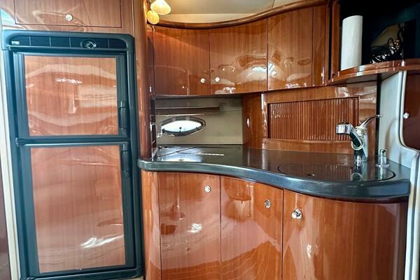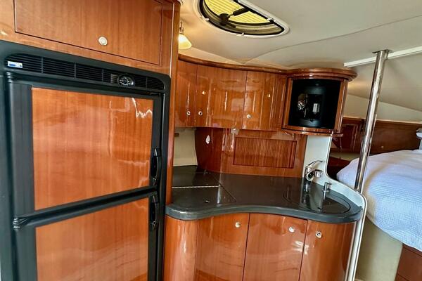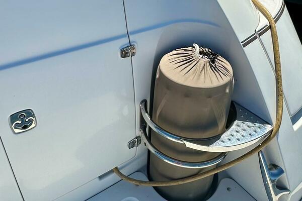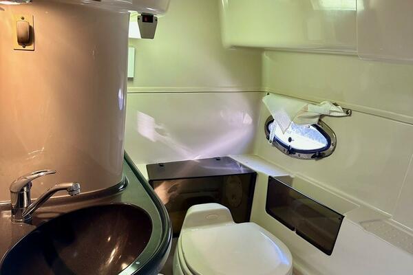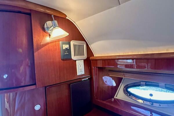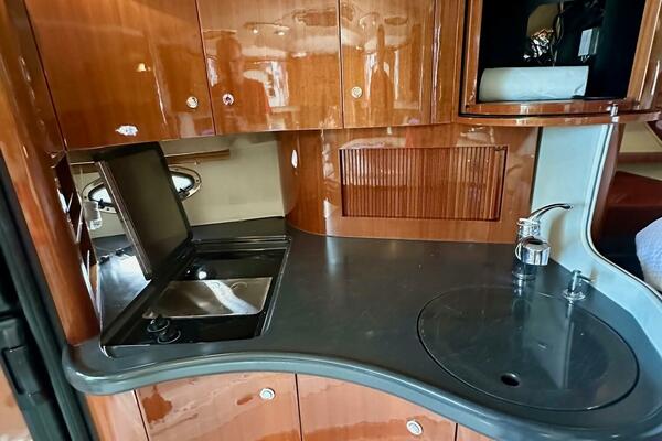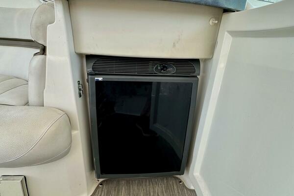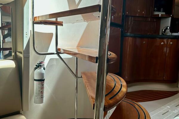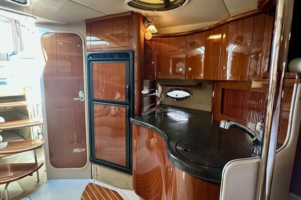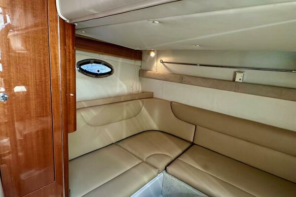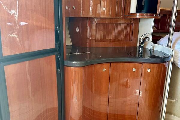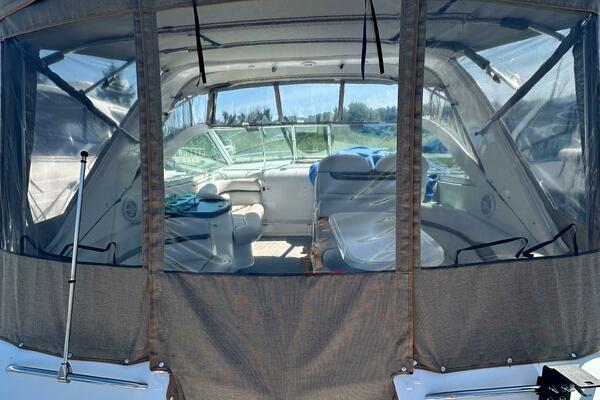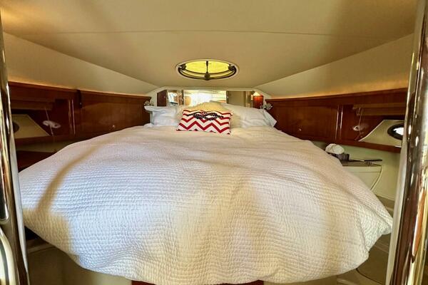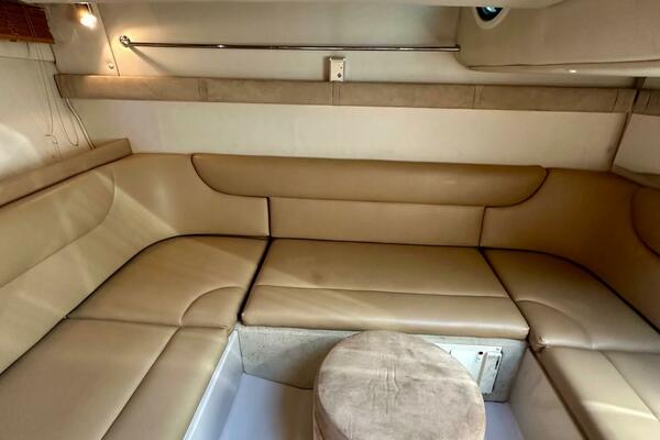 Standard features on the Doral Boca Grande include an integrated swim platform with telescopic ladder, extended welded 316 stainless steel heavy duty bow rail with extra safety line and lighted path, 8" non-skid deck walk around and a fiberglass retractable radar arch with built-in lights and night lighting. The built-in fiberglass dash featuring a wood steering wheel is specifically designed to provide easy access to information with everything at your fingertips. Some of the cockpits standard features include deluxe berber carpets, u-shaped cockpit seat with fiberglass lined storage, double helm seat with standing driving position system, and a cockpit refreshment area with bar.