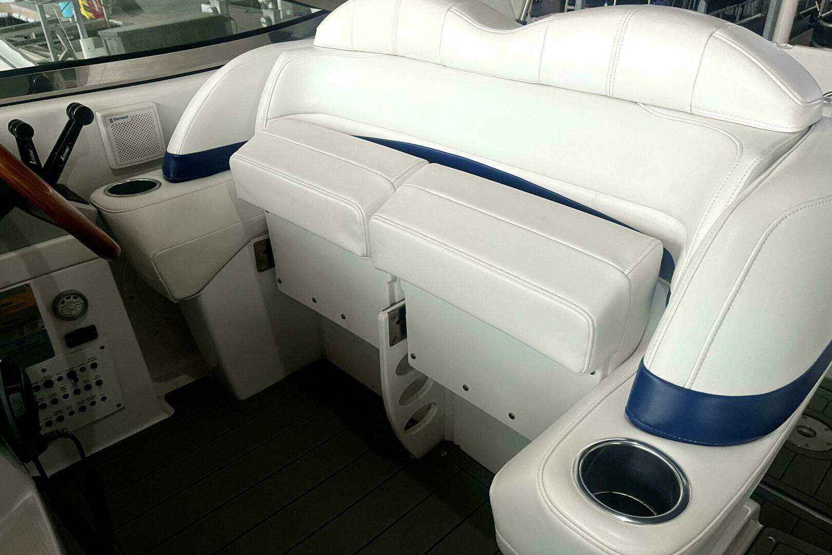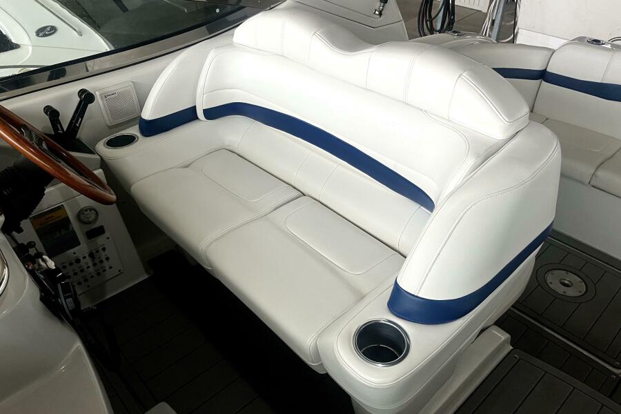 - Twin command seating w/dual-position helm & companion seats • Port lounge w/fiberglass-lined storage