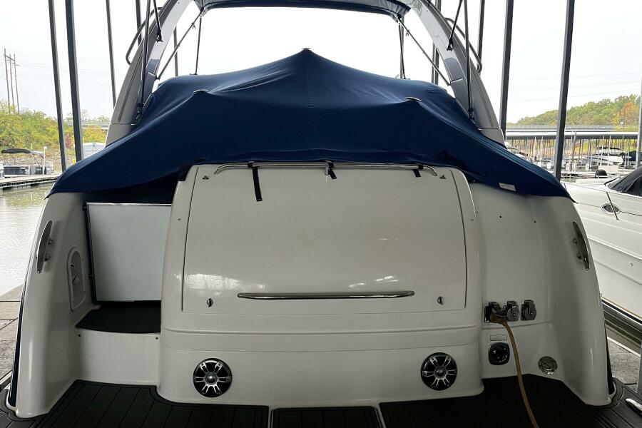 - Molded fiberglass transom trunk w/pneumatic lifts, fender storage, four fenders & storage for cockpit tables & cushion